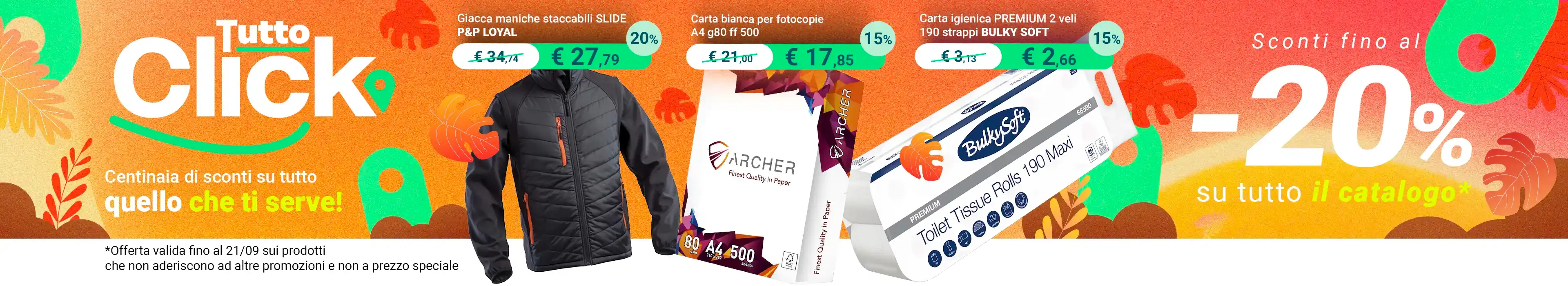 Se state cercando ingrosso cancelleria, forniture da ufficio, o abbigliamento da lavoro, ClickUfficio è il sito che fa per voi. Visitate il nostro catalogo online per scoprire tutte le soluzioni a vostra disposizione: dagli articoli di cancelleria indispensabili per l’operatività quotidiana, fino all'abbigliamento più specifico e professionale per ogni settore. Ogni categoria di prodotto è attentamente suddivisa per facilitarvi nella ricerca e per offrirvi le migliori opzioni in base alle vostre necessità.