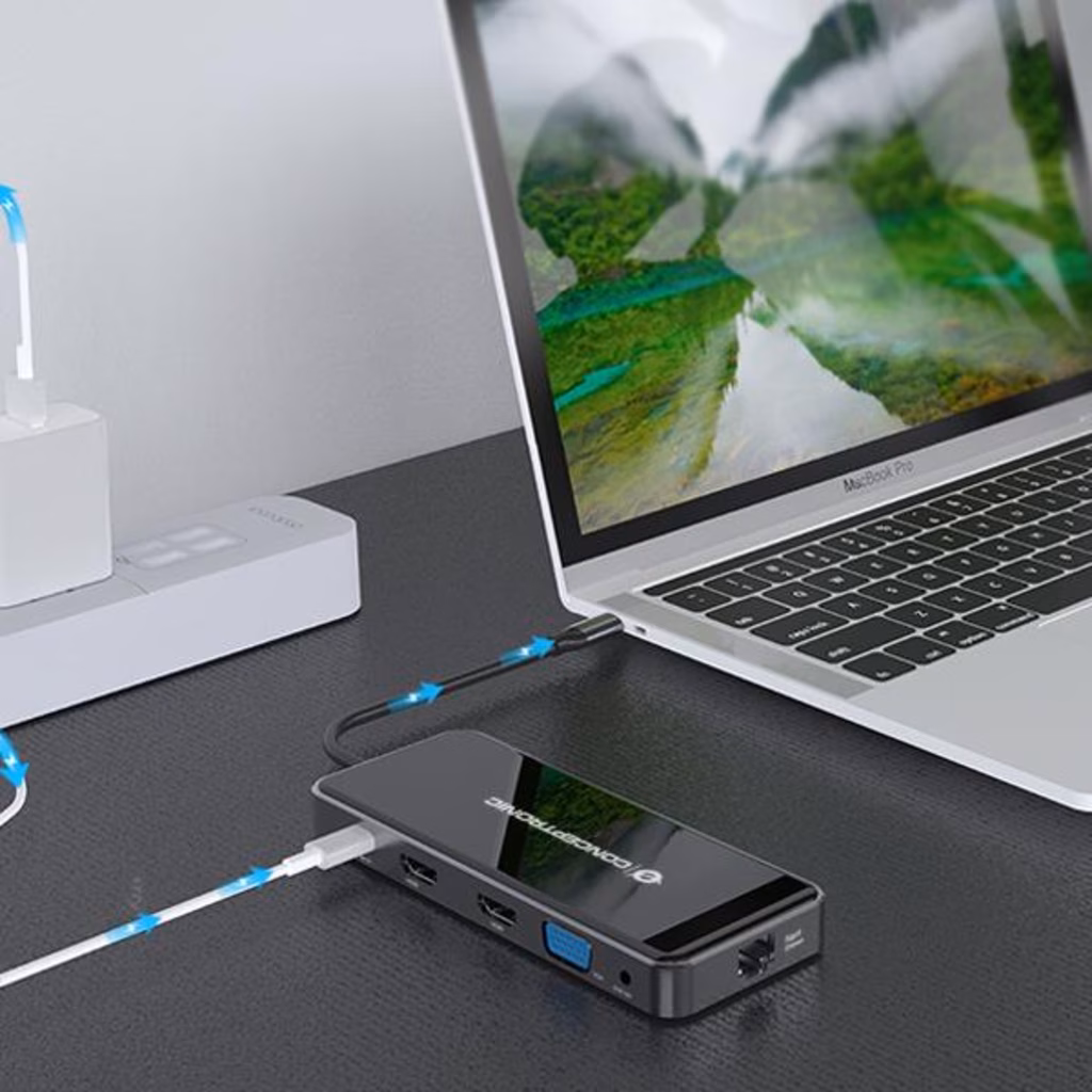 Questa docking station 12 in 1 consente di espandere la capacità USB Type-C del dispositivo con porte HDMI/VGA/USB-C PD/USB-C data/USB 3.0/USB 2.0/SD/TF/GbE/AUX. L'adattatore offre un modo semplice per aggiungere un televisore ad alta definizione o un'apparecchiatura come un monitor o un proiettore a qualsiasi dispositivo USB-C come uno smartphone, una console di gioco portatile, un MacBook, un Chromebook Pixel o qualsiasi altro computer portatile simile di ultima generazione dotato di porte USB-C. L'adattatore video multiporta consente di eseguire il mirroring o di estendere i contenuti su tre monitor aggiuntivi contemporaneamente (2 x HDMI, 1 x VGA), creando una workstation a tre schermi.