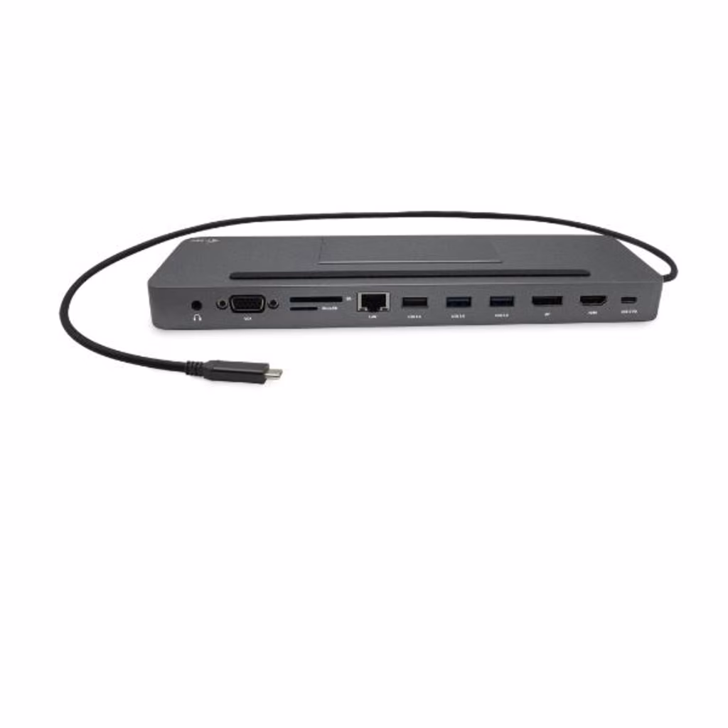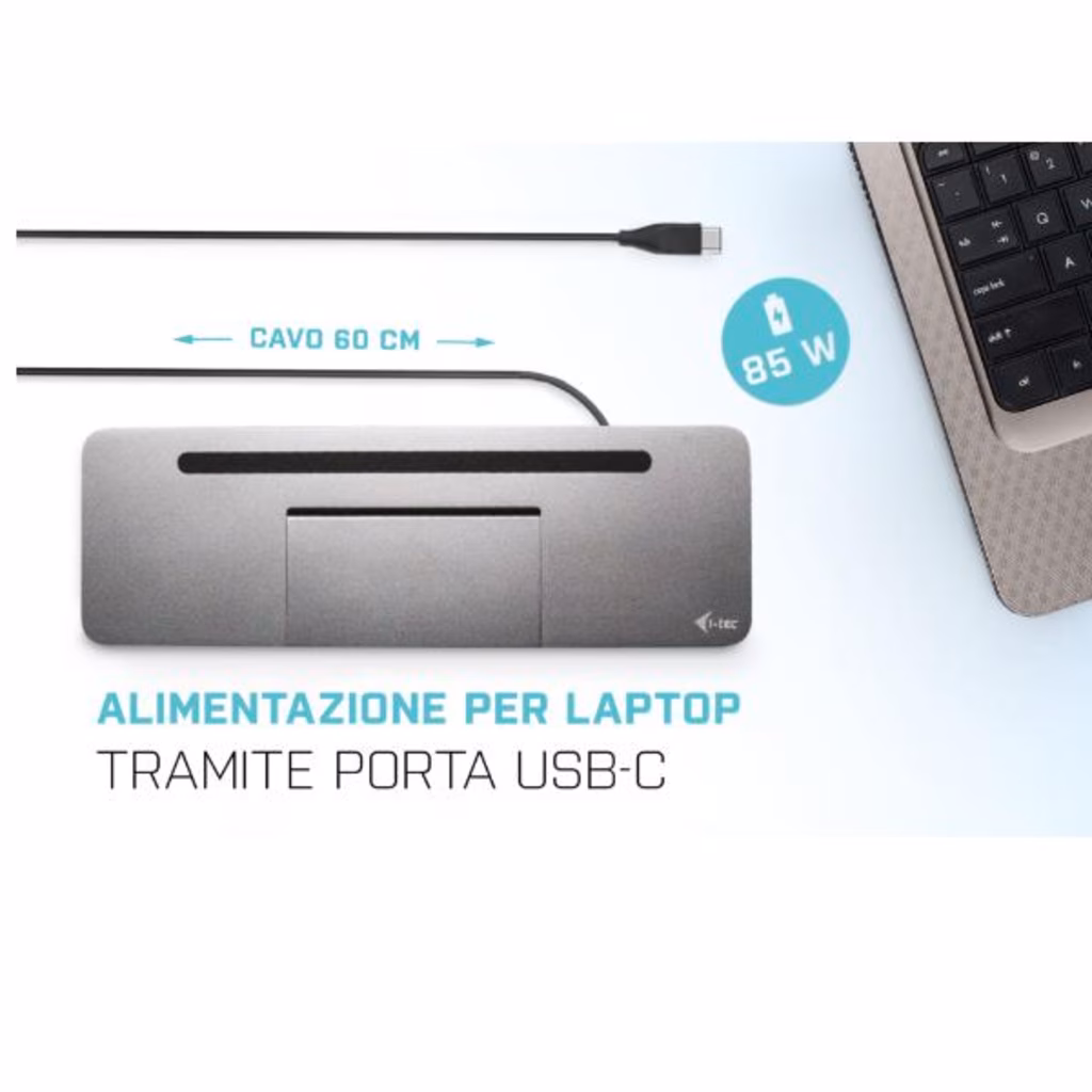 STAZIONI DI DOCKING 1x cavo USB-C integrato per il collegamento al dispositivo (60 cm) Tecnologia della docking station: USB-C (MST) Power Delivery: 85W Porte video: 1x Display Port 1 HDMI 1x VGA Risoluzione: Dispositivo host con supporto DisplayPort 1.2: 1 monitor 1x HDMI o DP ? fino a 4K/30Hz 1 monitor 1x HDMI o DP? fino a 1080p/120Hz 1 monitor 1x VGA ? fino a 1080p/60Hz 2 monitor 1x DP + 1x HDMI ? fino a 2x 1080p/60Hz* 2 monitor 1x DP + 1x VGA ? fino a 2x 1080p/60Hz* 2 monitor 1x VGA + 1x HDMI ? fino a 2x 1080p/60Hz* 3 monitor 1x HDMI + 1x DP + 1x VGA ? fino a 1x 1080p/60Hz + fino a 2x 720p/60Hz* 1 porta USB-C PD (solo power delivery) 2 porte USB 3.0 2 porte USB 2.0 1 porta Ethernet GLAN RJ-45 1 slot SD 1x microSD slot 1x Audio Jack 3.5 mm per collegare cuffie e microfono Clonazione dell indirizzo MAC: Sì (utilizzando il software i-tec Docker Pro) WOL: S1, S2, S3 OS: Windows 10/11, macOS*, iPadOS**, Android**, Chrome OS e Linux con gli ultimi aggiornamenti Dimensioni del prodotto: 269 x 84 x 23 mm Peso del prodotto: 324 g Dimensioni imballo: 316 x 130 x 30 mm