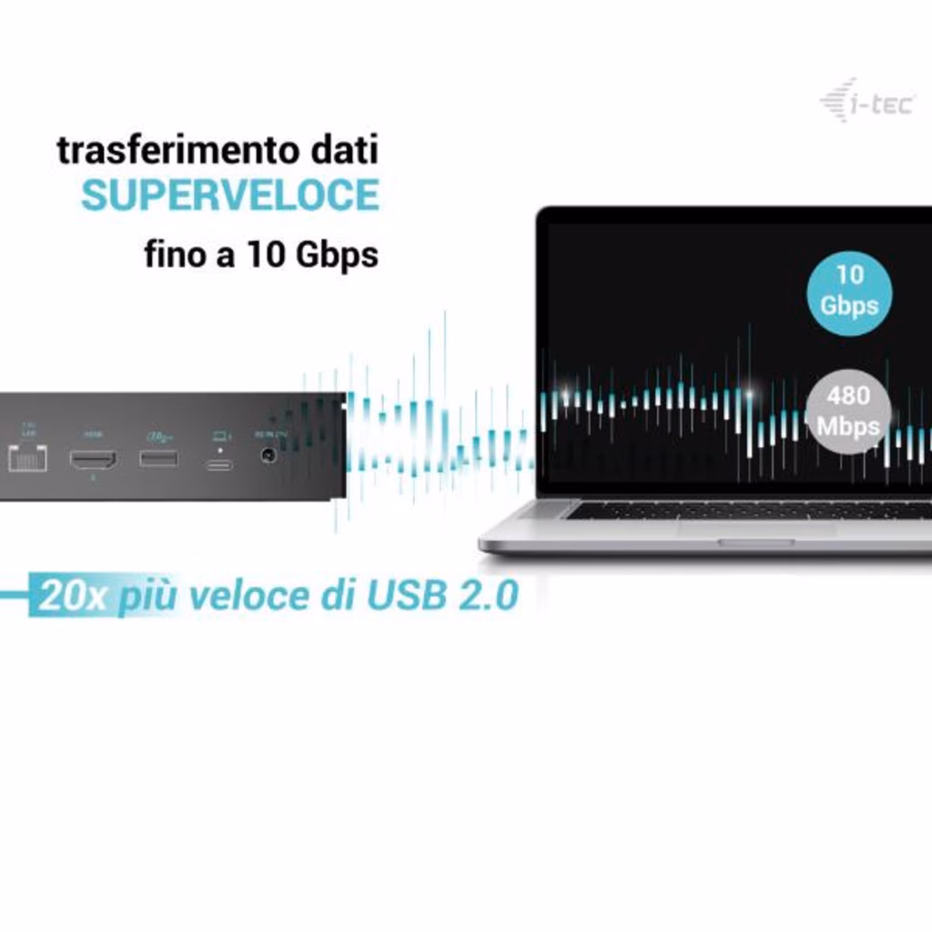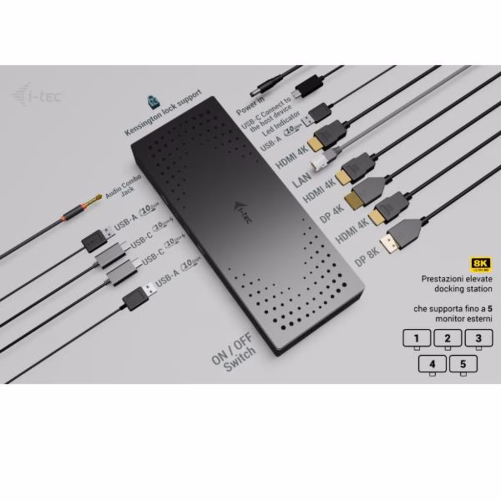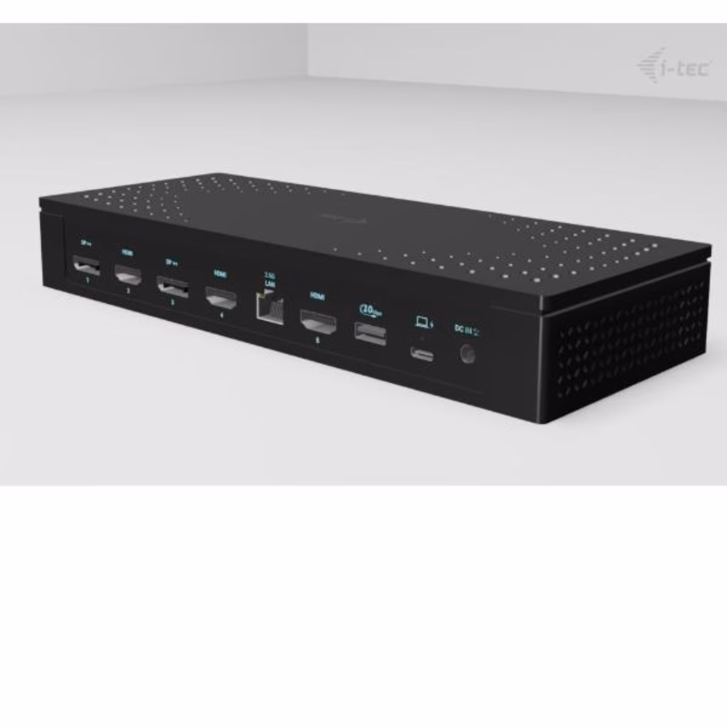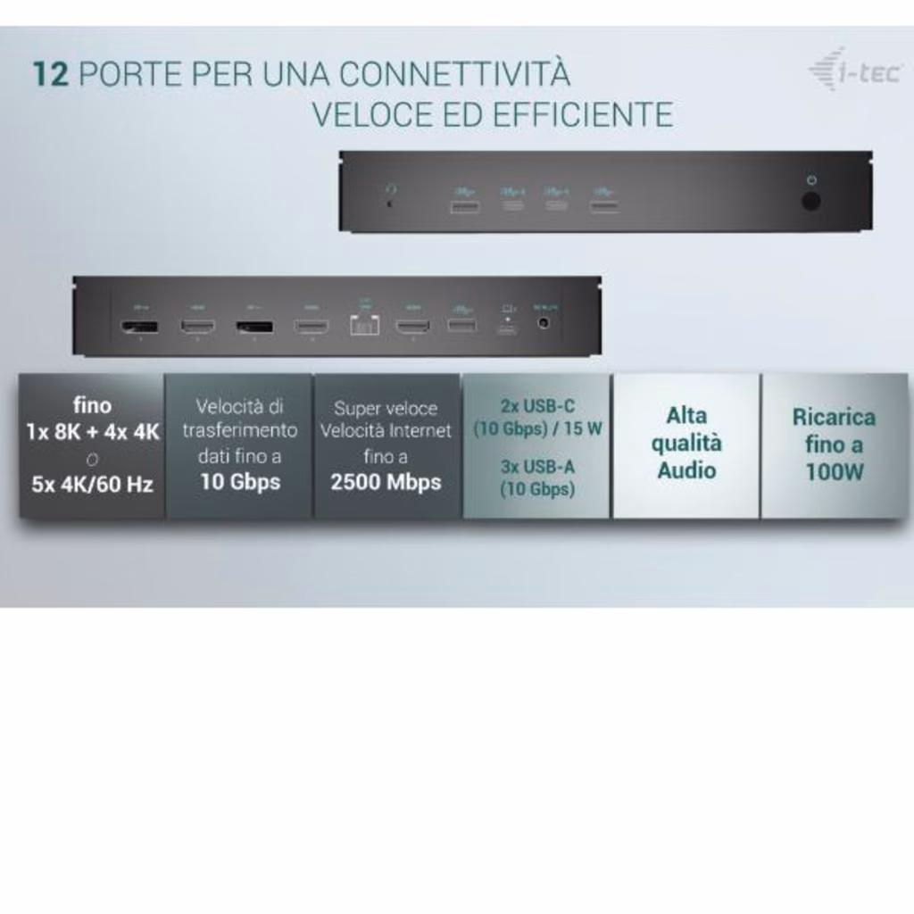 Il dock può essere installato dietro il monitor (se supporta un supporto VESA standard), utilizzando il supporto VESA i-tec VESADOCK1 . Supporto per un massimo di 5 monitor esterni* con risoluzione 1x 8k/60Hz o 5x 4K/60Hz Porte video: 3x HDMI* e 2x DP 2x USB-C (10 Gbps), con supporto di ricarica fino a 15W 3x USB-A (10 Gbps) Porta LAN fino a 2,5 Gbps (10/100/1000/2500 Mbit) Porta audio/microfono da 3,5 mm Alimentazione del portatile fino a 100 W Pulsante di accensione/spegnimento della docking station Supporto per l installazione dietro un monitor