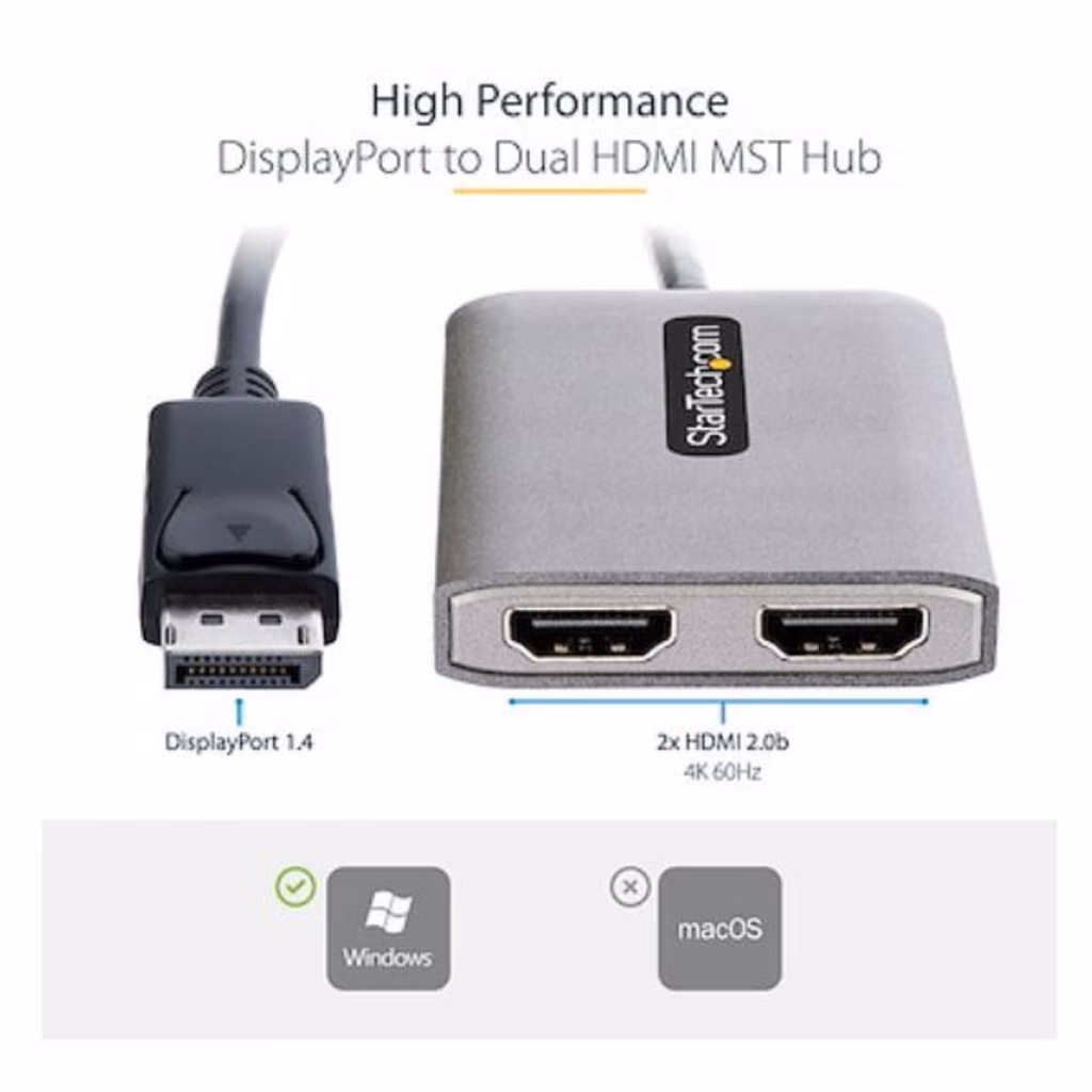 Questo HUB MST da DisplayPort a HDMI gestisce 2 Monitor HDMI 4K 60Hz da 1 dispositivo Windows abilitato per DisplayPort.                                                                                                                                    Multi-Tasking Facilitato: Questo Adattatore da DisplayPort a HDMI permette di collegare fino a due Monitor aggiuntivi in modalità duplica o estesa. Collegando due Display 4K 60Hz indipendenti si possono creare postazioni di lavoro ad alte prestazioni per gli utenti della vostra azienda, consentendo un comodo multi-tasking, con conseguente aumento della produttività.                                                                            4K a 60Hz e HDR: Il supporto nativo per MST, su qualsiasi dispositivo Windows, consente una semplice configurazione. Questo HUB MST separa il singolo flusso video in due segnali indipendenti, uno per ogni display HDMI abilitato. Il supporto per l'High Dynamic Range (HDR) consente di avere maggiore contrasto, luminosità, colori e maggiore luminosità.                                                                                      Configurazione senza problemi: Questo HUB MST permette una configurazione semplificata, essendo nativamente disponibile su qualsiasi dispositivo Windows. Installazione plug-and-play senza necessità di driver o software. Il cavo da 30 cm integrato consente opzioni di installazione flessibili, riducendo lo sforzo sulle porte e sui connettori. Lo splitter per doppio monitor è alimentato direttamente via USB (cavo USB incluso). Adattatore compatibile con Windows 10 e Windows 11.