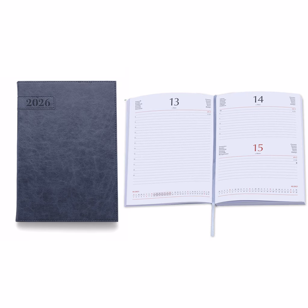 Agenda a blocco fisso con copertina flessibile in poliuretano termovirante - 320 pagine versione giornaliera (sabato e domenica abbinati) stampate a 2 colori su carta usomano bianca da 60 g/m2 - segnapagine - 4 pagine cartina geografica da 80 g/m2 - rubrica telefonica - edizione multilingue - millesimo stampato a secco