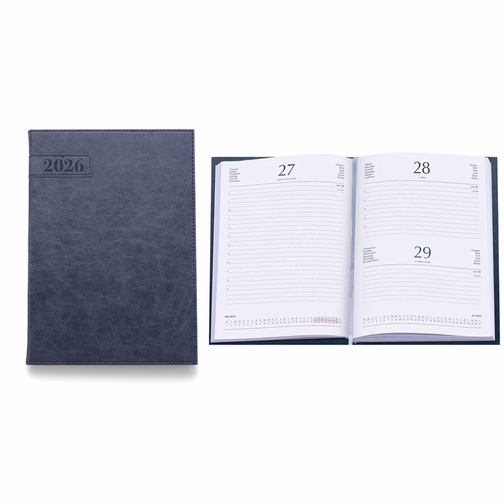 Agenda a blocco fisso con copertina flessibile in poliuretano termovirante - 320 pagine versione giornaliera (sabato e domenica abbinati) stampate a 2 colori su carta usomano bianca da 60 g/m2 - segnapagine - 4 pagine cartina geografica da 80 g/m2 - rubrica telefonica - edizione multilingue - millesimo stampato a secco