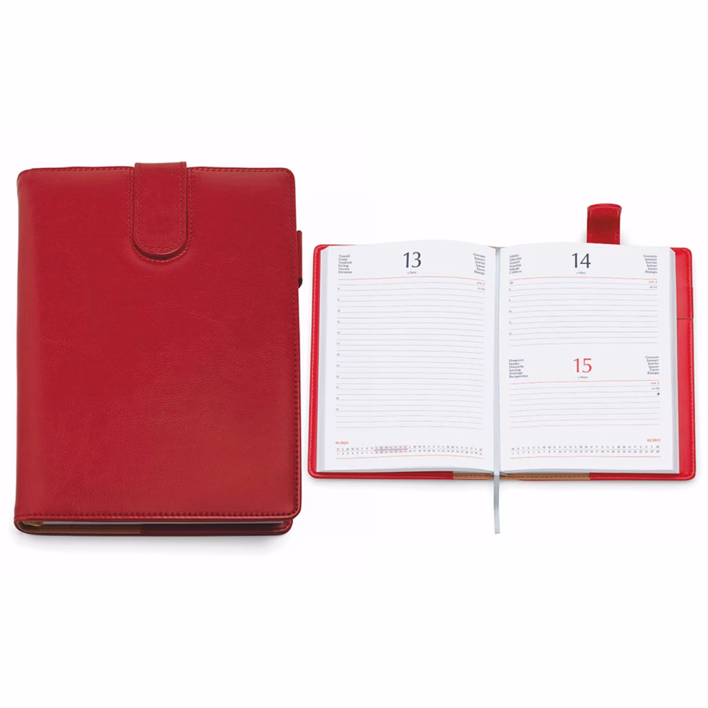 Agenda a portafoglio chiusura con fibbia calamitata posizionata nella parte alta della copertina - copertina in similpelle - interno mobile giornaliero (sabato e domenica abbinati) - 320 pagine stampate a 2 colori su carta usomano bianca da 60 g/m2 - inserto per penna - corredata di astuccio regalo - formato esterno chiuso cm 17x22 - formato utile chiuso cm 15x21