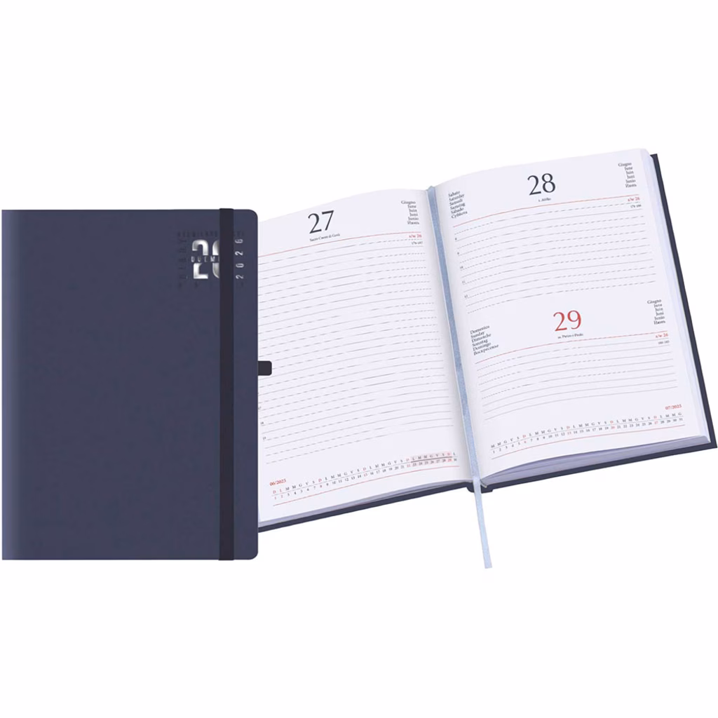 Agenda con elastico - copertina cartonata in materiale Matra - 320 pagine versione giornaliera (sabato e domenica abbinati) stampate a 2 colori su carta usomano bianca da 60 g/m2 - segnapagine - cartina geografica - rubrica telefonica - edizione multilingue - formato chiuso cm 17x24