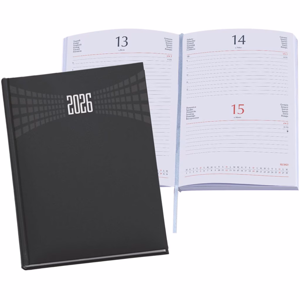 Agenda con copertina in materiale Matra - 320 pagine versione giornaliera (sabato e domenica abbinati) stampate a 2 colori su carta usomano bianca da 60 g/m2 - segnapagine - cartina geografica - rubrica telefonica - edizione multilingue - angolo segnapagine perforato - formato chiuso cm 15x21