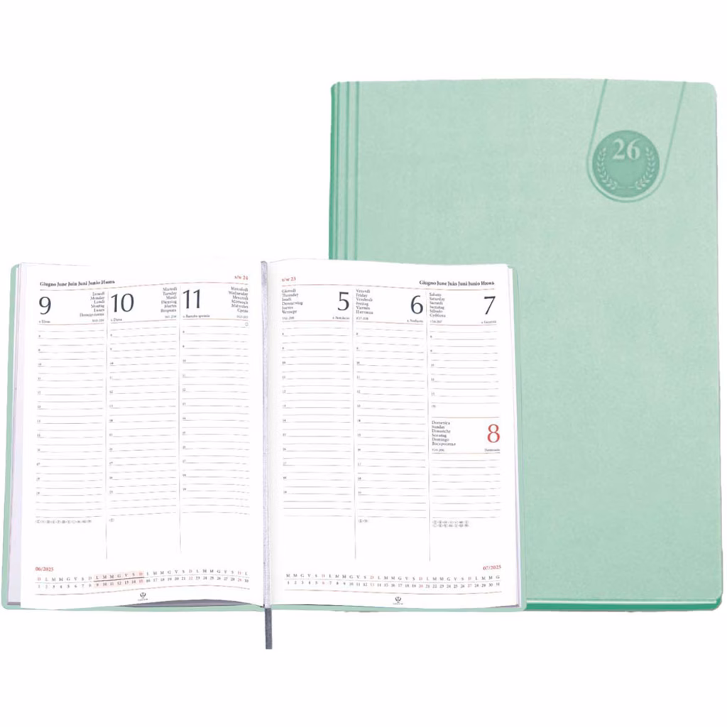 Agenda con copertina flessibile in materiale printflex termovirante - 128 pagine versione settimanale (una settimana su due pagine) stampate a 2 colori su carta usomano bianca da 80 g/m2 - segnapagine - 4 pagine cartina geografica - rubrica telefonica - edizione multilingue - formato chiuso cm 17x24