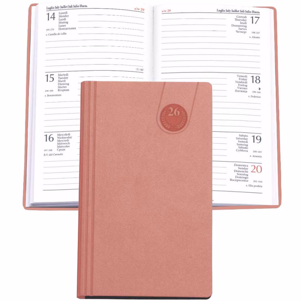 Agenda con copertina flessibile in materiale printflex termovirante - 128 pagine versione settimanale (una settimana su due pagine) stampate a 2 colori su carta usomano bianca da 60 g/m2 - rubrica telefonica - edizione multilingue - formato chiuso cm 8x14