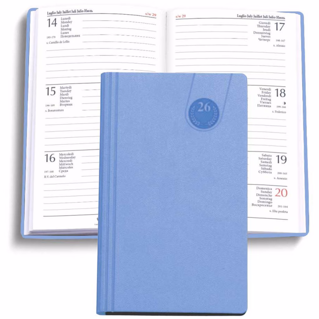 Agenda con copertina flessibile in materiale printflex termovirante - 128 pagine versione settimanale (una settimana su due pagine) stampate a 2 colori su carta usomano bianca da 60 g/m2 - rubrica telefonica - edizione multilingue - formato chiuso cm 8x14