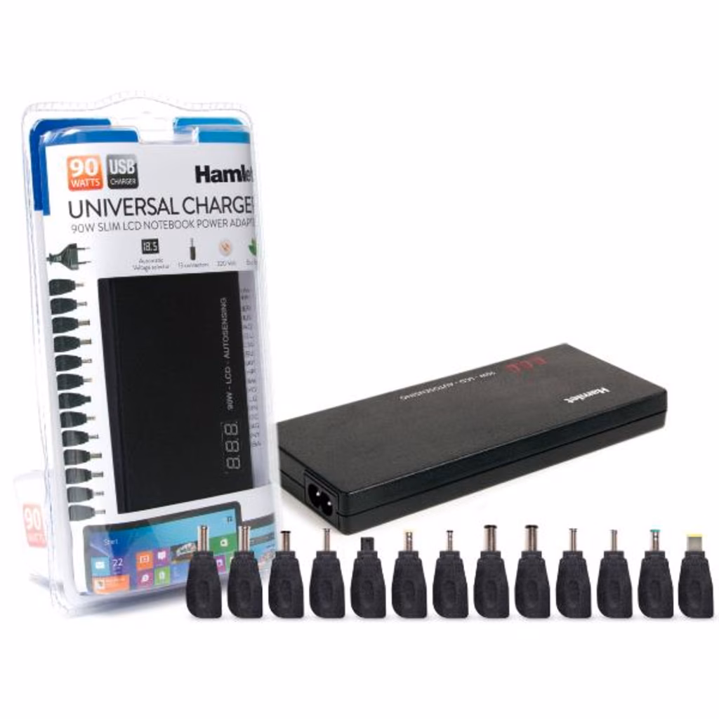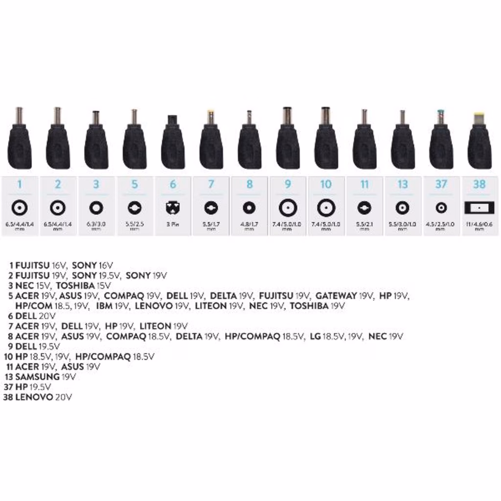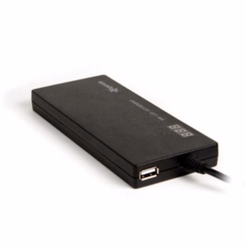 Alimentatore universale ultra compatto per computer portatili con solo 16 millimetri di spessore, utile come ricambio o come alimentatore secondario a casa o in ufficio. Selezione automatica della tensione; fornisce la tensione di alimentazione al notebook in uso senza la necessità di eseguire impostazioni manuali. La porta USB aggiuntiva permette la ricarica del proprio lettore MP3 o telefono cellulare. Dotato di 13 connettori per le principali marche di Notebook in commercio. Ora disponibile con nuovi connettori per HP e Lenovo.caratteristiche