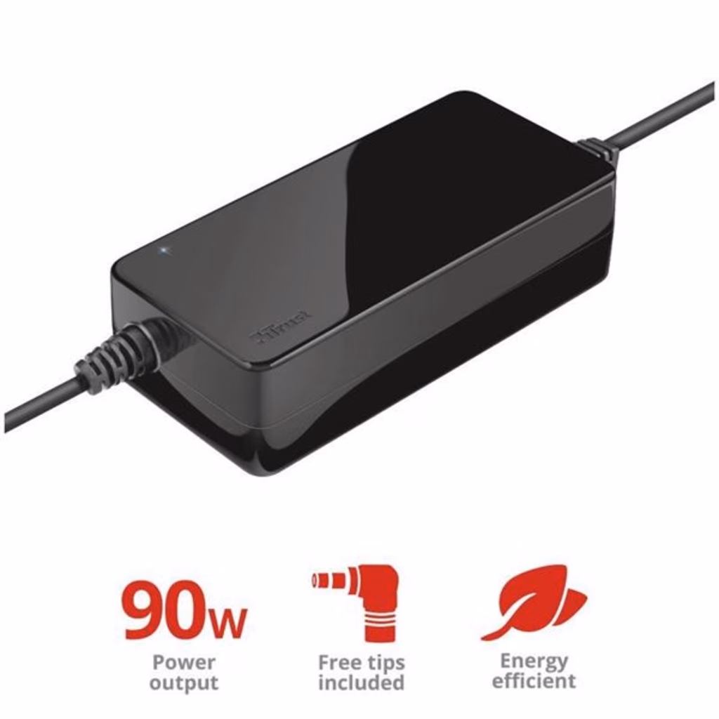 Caricabatterie universale per laptop con potenza in uscita di 90 W. Sistema di protezione intelligente per una ricarica sicura e rapida. Ideale in viaggio: design compatto e funzionamento a 100-240 V, 50/60 Hz.