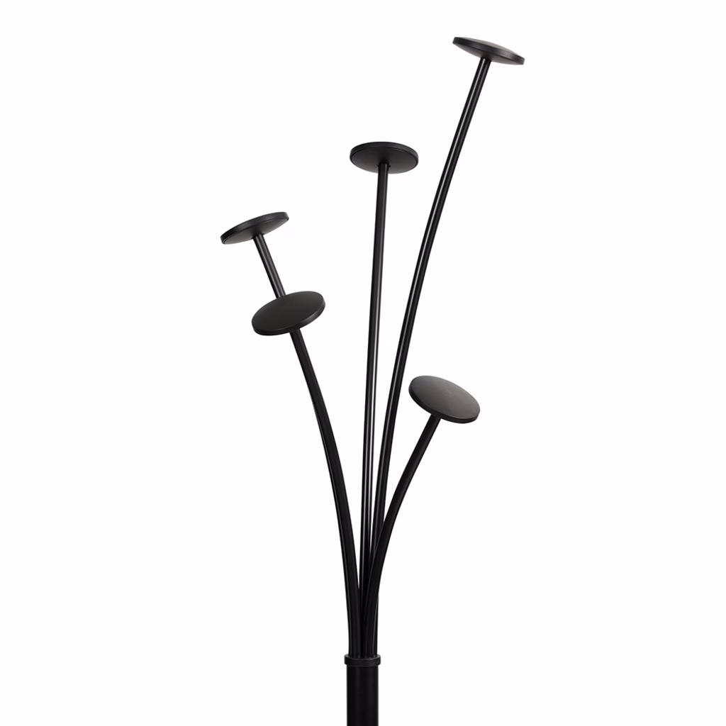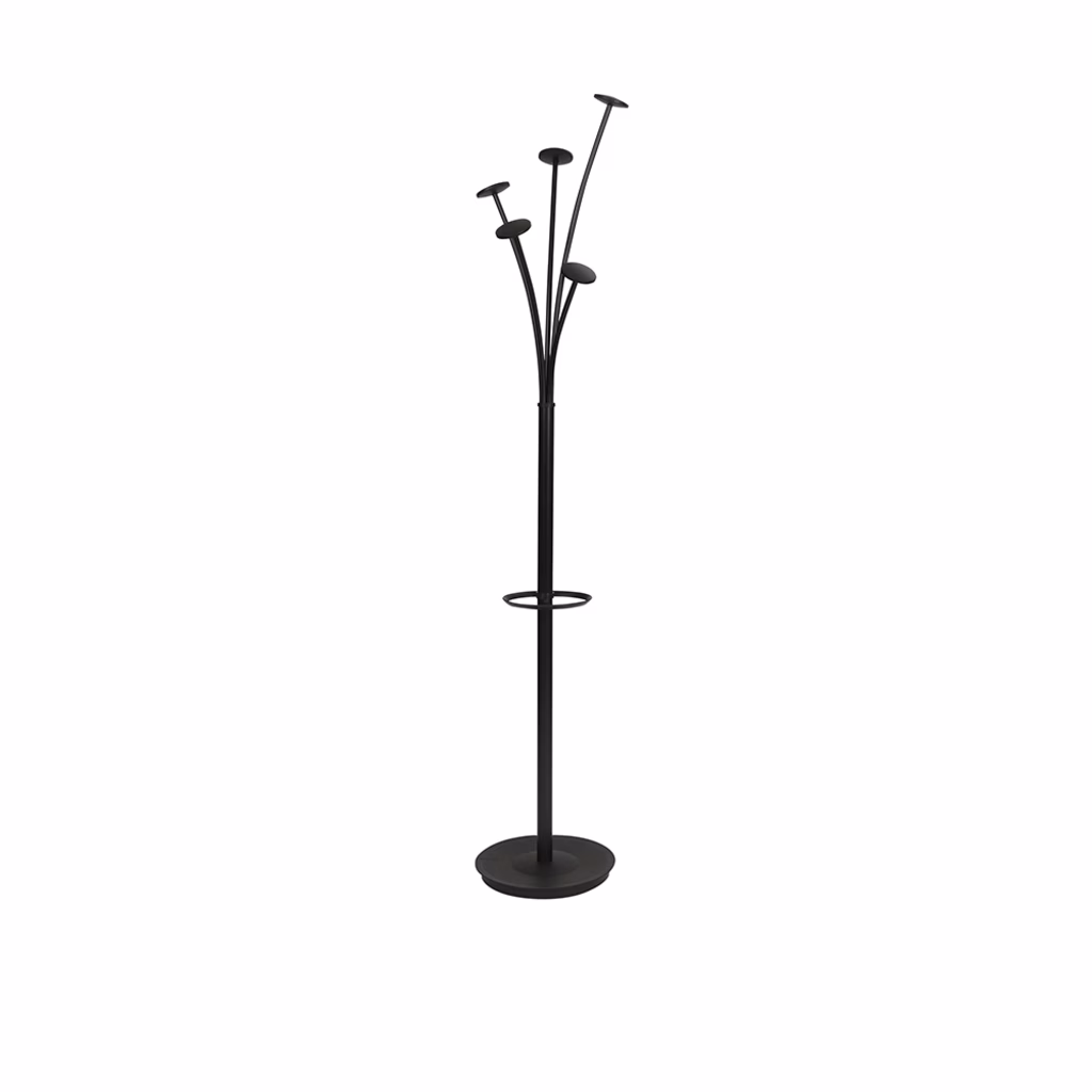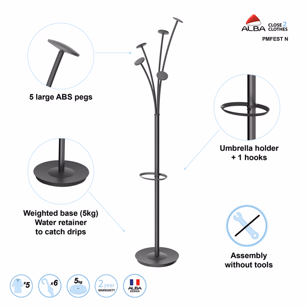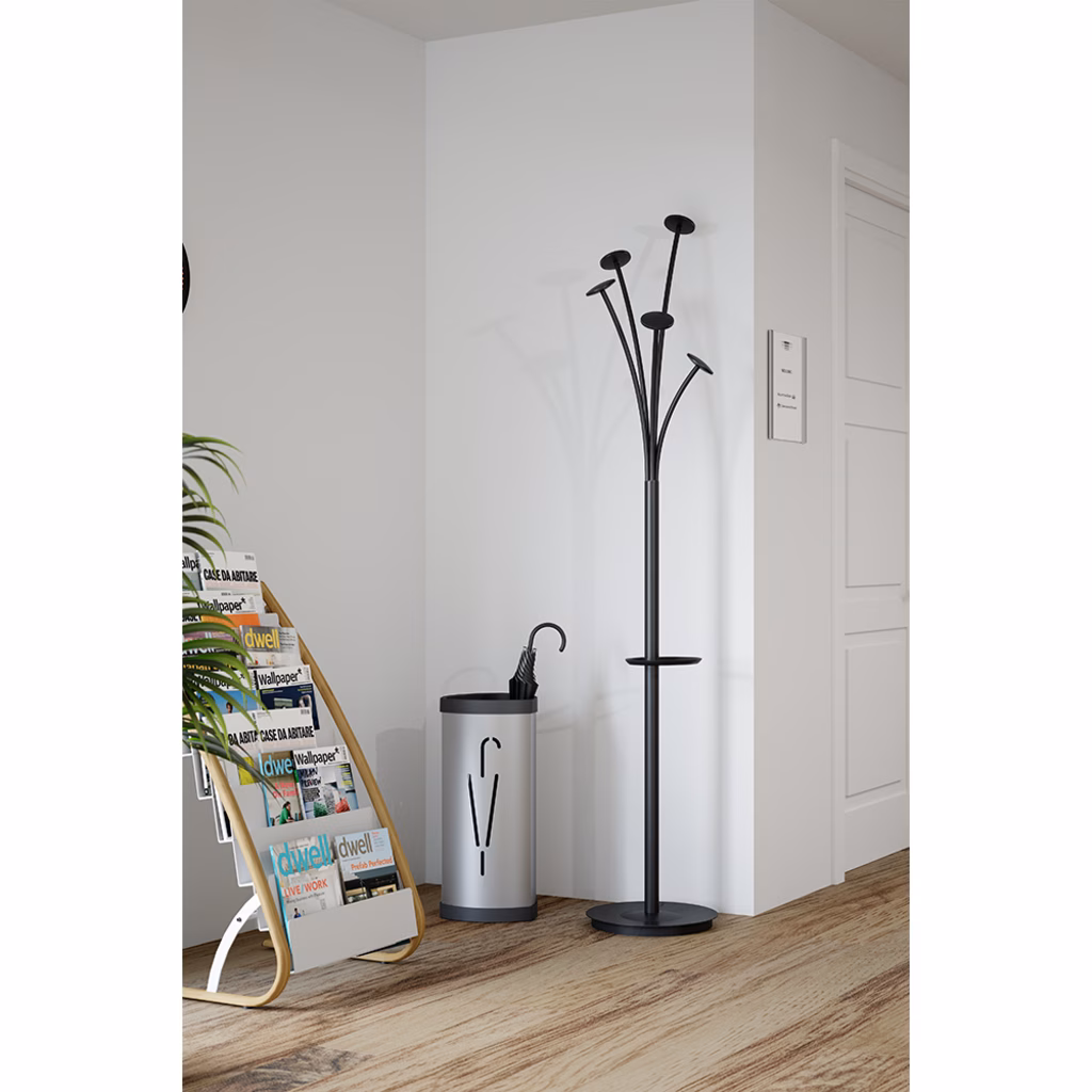 Appendiabiti da terra in metallo verniciato con accessori in ABS - è dotato di 5 grandi pomoli doppi, un portaombrelli e base appesantita di kg 5 per la massima stabilità, dotata di vaschetta per raccogliere lacqua - sistema di assemblaggio semplice e veloce senza attrezzi - base: Ø 35,5 cm - altezza 187 cm