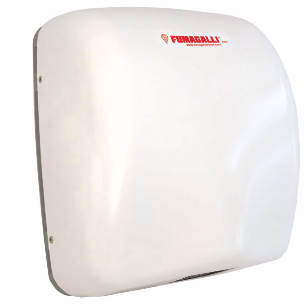 Asciugamani elettrico ad aria calda ad ingombro ridotto con azionamento a fotocellula. Corpo macchina a disegno semplice per una rapida pulizia e coperchio in acciaio al carbonio per le versioni bianco o antracite, o in acciaio inox AISI 304 in finitura lucida o satinata. Gruppo motore a induzione che non necessita di manutenzione. Tempo di asciugatura medio: 30 secondi. Classe di isolamento = Classe II. Azionamento tramite fotocellula. La profondità ridotta lo rende particolarmente adatto alle toilette di piccole dimensioni. Motore a lunga durata, oltre 2.000.000 di asciugature.
