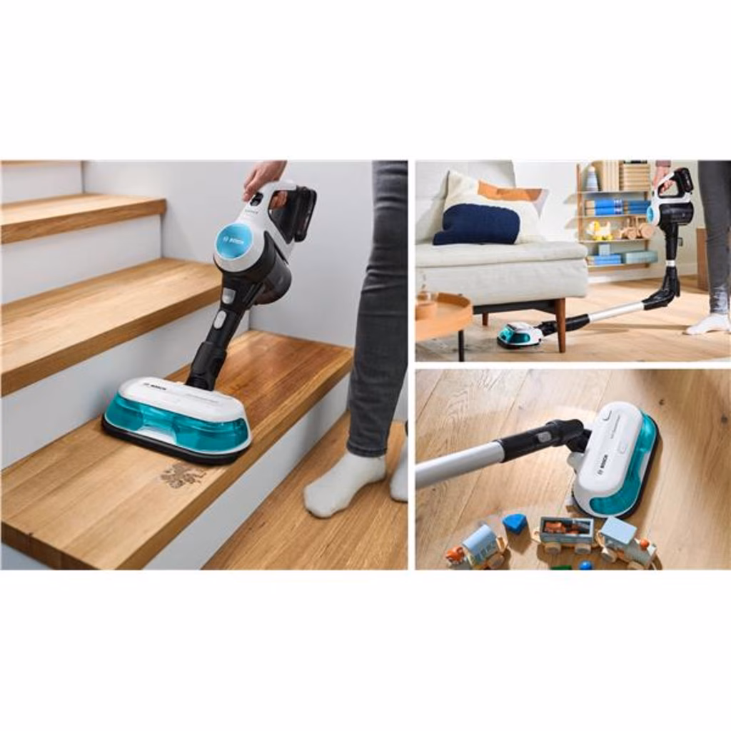 Bosch Scopa elettrica lavapavimenti 2in1 Unlimited 7 ProHygienic Aqua BiancoPulizia igienica: accurata e semplice La scopa elettrica Unlimited 7 ProHygienic Aqua aspira e lava in un'unica soluzione: il modo più semplice per avere una casa igienicamente pulita. Aspirazione e lavaggio avvengono contemporaneamente: l'elevata potenza del canale di aspirazione rimuove ogni particella di polvere, mentre i due panni in microfibra rotanti, costantemente inumiditi con acqua fresca, eliminano anche le macchie più ostinate. La scopa elettrica Unlimited 7 ProHygienic Aqua è la soluzione perfetta per una pulizia ostinata: l'aria in uscita ha una filtrazione del 99,97% delle particelle di polvere alle note a piè di pagina , lava con acqua fresca e permette una manutenzione igienica senza entrare a contatto con la sporco. Elimina le macchie più ostinate. Rimuovere le macchie ostinate è diventato un gioco da ragazzi. La scopa elettrica Unlimited 7 ProHygienic Aqua offre un'efficace pulizia grazie a due componenti: i panni rotanti in microfibra rimuovono lo sporco sul pavimento con una velocità di rotazione fino a 200 giri al minuto. Dall'altro lato, il sistema di dosaggio automatico dell'acqua fa in modo che i panni in microfibra rimangano sempre umidi. A seconda della pulizia, è possibile inumidire maggiormente i panni in microfibra con la funzione boost o interrompere il dosaggio automatico premendo il pulsante di controllo dell'acqua per 3 secondi. Pulizia accurata di tutti i pavimenti Unlimited 7 ProHygienic Aqua è dotata di due spazzole che combinano flessibilità e facilità di utilizzo: la spazzola DynamicAqua 2in1 per aspirare e lavare in un'unica soluzione i pavimenti e la spazzola DynamicPower AllFloor per aspirare efficacemente ogni tipo di superficie. Inoltre, il pratico tubo flessibile consente di raggiungere facilmente i mobili bassi o i divani senza doversi chinare. Spazzola motorizzata con luci LED Goditi risultati di pulizia ottimali su tutte le superfici, inclusi gli angoli più difficili e nascosti. La potente spazzola motorizzata raggiunge una capacità di raccolta della polvere di oltre al 99,9%. Grazie alle potenti luci a LED integrate, è possibile individuare facilmente sporco e polvere anche in luoghi difficili da vedere come dietro i mobili o negli angoli bui. Inoltre, è possibile raccogliere il 30% in più di polvere sui tappeti, per una casa pulita in un batter d occhio. Sistema di filtrazione HEPA di Bosch Una qualità dell'aria eccellente è importante, soprattutto per chi soffre di allergie. Grazie al sistema di filtrazione HEPA il 99,97% delle particelle di polvere fine vengono filtrate e impediscono che vengano rilasciate nella stanza. La combinazione di vari filtri assicura che l'aria immessa nella stanza sia più pulita dell'aria normale della casa. Inoltre, il filtro a rete metallica di qualità superiore garantisce una pulizia facile e igienica. 33 % di durata in più per pulire fino a 100 m². Con la batteria da 3.0 Ah Power For All di Bosch, potente e di lunga durata, anche le pulizie più impegnative possono essere eseguite senza sforzo. La batteria agli ioni di litio è ricaricabile, intercambiabile e protetta da surriscaldamento e sovraccarico. Inoltre, la batteria garantisce il 33% in più di durata* , mantenendo prestazioni elevate e costanti. È possibile pulire fino a 100 m² con una sola carica della batteria* - senza interruzioni e senza preoccuparsi del tempo di ricarica. Motore Bosch Qualità made in Germany. Sperimenta performance eccellenti con gli aspirapolvere Bosch: progettiamo e produciamo motori da oltre 80 anni e da un aspirapolvere ci aspettiamo risultati di pulizia ottimali uniti a una lunga durata. Ecco perché offriamo una garanzia di 10 anni sul motore alle note a piè di pagina. L'igiene si estende alla manutenzione La manutenzione è molto semplice e igienica. È sufficiente svuotare il serbatoio dell'acqua pulita, se non è già vuoto. Grazie alle apposite linguette sui panni in microfibra, questi possono essere rimossi e messi in lavatrice senza entrare a contatto con lo sporco. I panni in microfibra riutilizzabili possono essere lavati a 40°C in lavatrice oppure possono essere lavati a mano. Per motivi igienici, si consiglia di lavarli in lavatrice dopo ogni utilizzo. Anche il contenitore della polvere è facile e igienico da pulire. Si può svuotare direttamente nel cestino. Serbatoio dell'acqua: per pulire con acqua fresca, fino a 50mq in una sola volta. La spazzola DynamicAqua 2in1 è dotata di un serbatoio dell'acqua rimovibile, che può essere riempito direttamente dal rubinetto. Il serbatoio dell'acqua ha una capacità di 250 ml, sufficiente per pulire fino a 50 m².. Per aumentare ulteriormente il livello di igiene, aggiungere al serbatoio alcune gocce di un detergente per pavimenti adatto. La quantità perfetta per una pulizia efficace Non c'è bisogno di preoccuparsi che troppa acqua finisca sul pavimento delicato. Il sistema di dosaggio automatico dell'acqua fornisce la giusta quantità d'acqua. L'acqua viene erogata continuamente sui panni in microfibra. Con il pulsante di controllo dell'acqua è possibile adattarlo a qualsiasi situazione. Per una maggiore quantità d'acqua, per rimuovere macchie particolarmente ostinate, premere il pulsante per 3 secondi. Per interrompere il sistema di dosaggio automatico dell'acqua, premere una volta il pulsante.