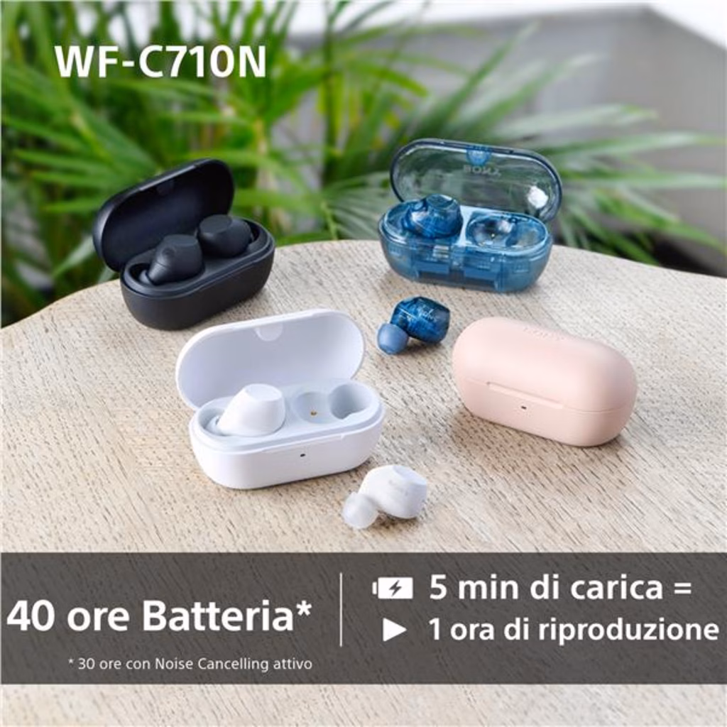 Fino a 40 ore di riproduzione ininterrotta (12 ore con gli auricolari + 28 ore con la custodia) e ricarica rapida. Grazie alla tecnologia Precise Voice Pickup con AI, le WF-C710N sono in grado di effettuare chiamate vocali chiare anche in ambienti rumorosi.