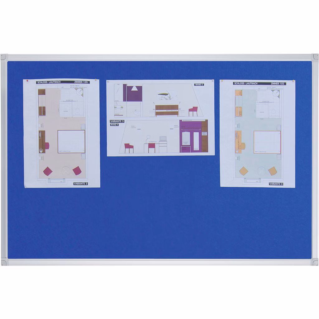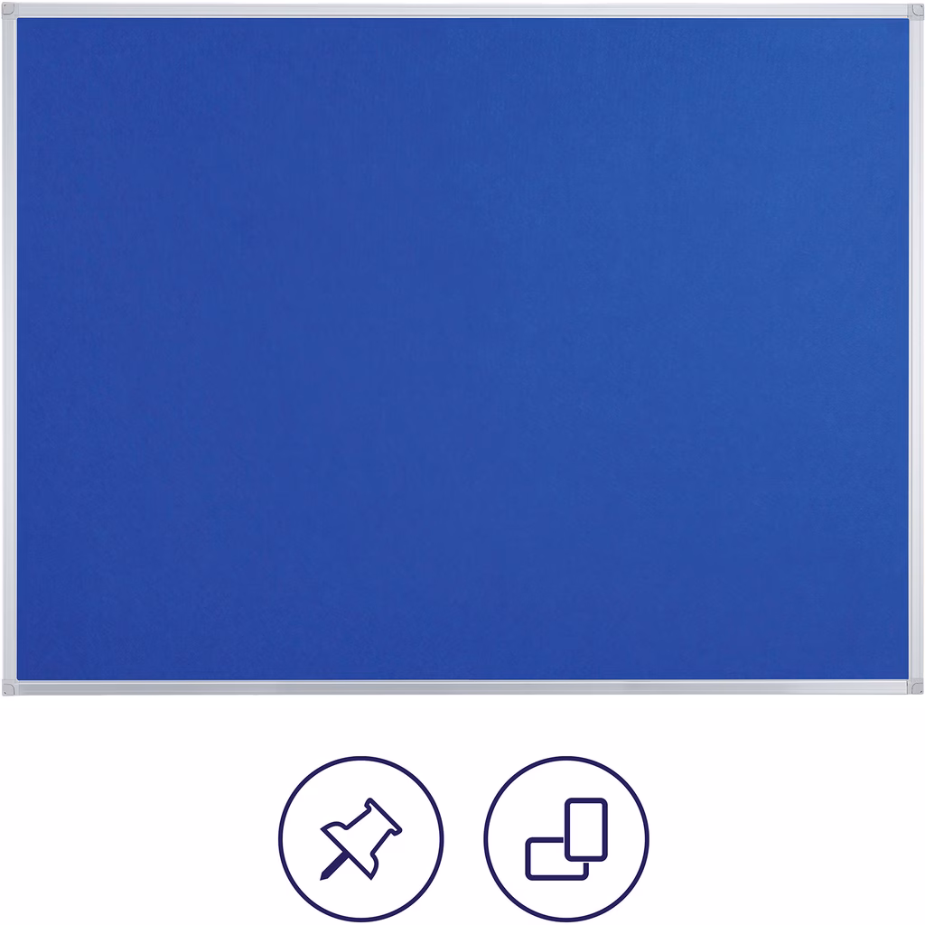 Bacheca economica in feltro adatta a qualsiasi ambiente d'ufficio, che può essere esposta in formato orizzontale o verticale, perfetta per appuntare ed esporre materiali. Con telaio in alluminio anodizzato argento e kit di montaggio con fissaggi angolari standard o nascosti inclusi. Dimensioni 90x60 cm.