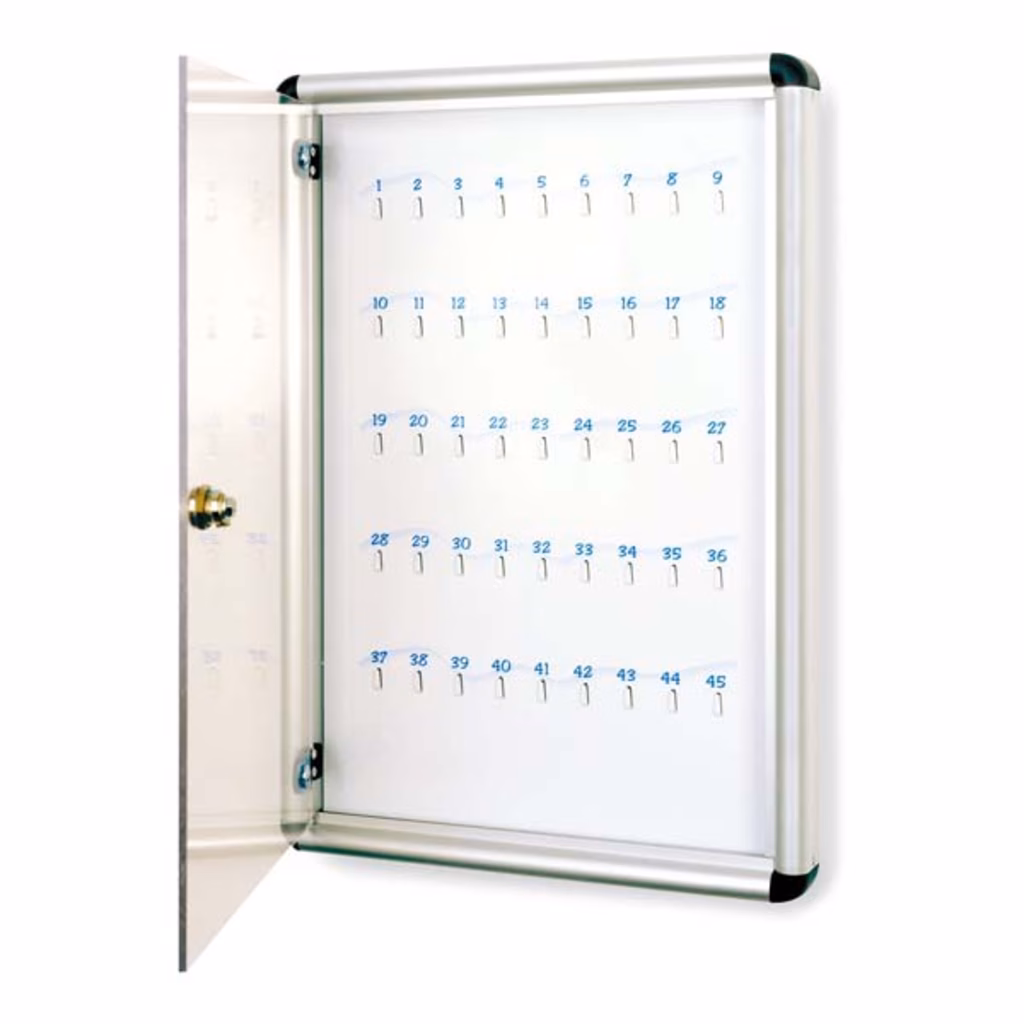 Bacheca portachiavi con fondo in acciaio smaltato e telaio in alluminio anodizzato - aperture a libro con anta in crilex trasparente - chiusura con serratura - ganci portachiavi numerati - tasselli per fissaggio a muro inclusi