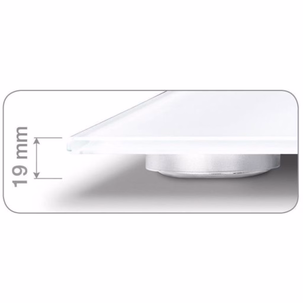 Superficie di appoggio in vetro di sicurezza. Dimensione cifre: 26 mm. Sottile, altezza di soli 19 mm. Commutazione kg/lb/st - Portata: 180 kg - Graduazione 100 g - Indicatore di sovraccarico - Dispositivo di accensione e di arresto automatico - Inclusa 1 batteria da 3 V CR 2032