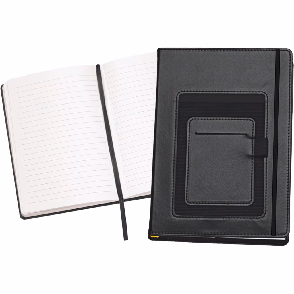 Blocco notes con elastico con tasca frontale porta cellulare - copertina in poliuretano - 100 fogli/200 pagine in carta bianca a righe - vari scomparti esterni p/cellulare, p/card e p/penna - fornito confezionato in scatola di cartone bianco - formato A5 cm 14,2x20,5