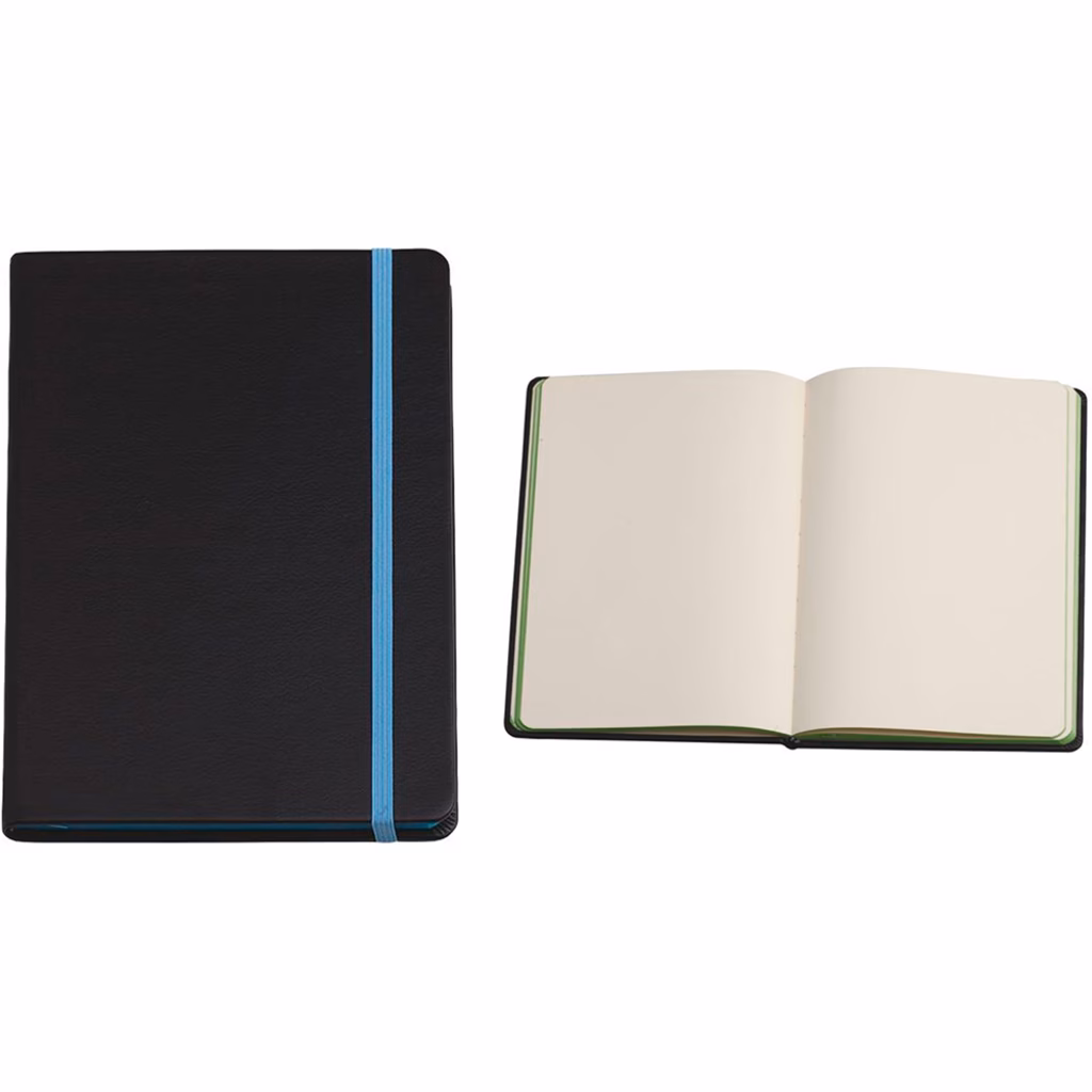 Blocco notes con elastico - copertina in poliuretano colore nero - profilo colorato in tono con l'elastico - incisione laser colorata sulla copertina con logo nello stesso colore dell'elastico - 80 fogli/160 pagine in carta avorio neutra da 70 g/m2 - formato A5 cm 14,5x21,3