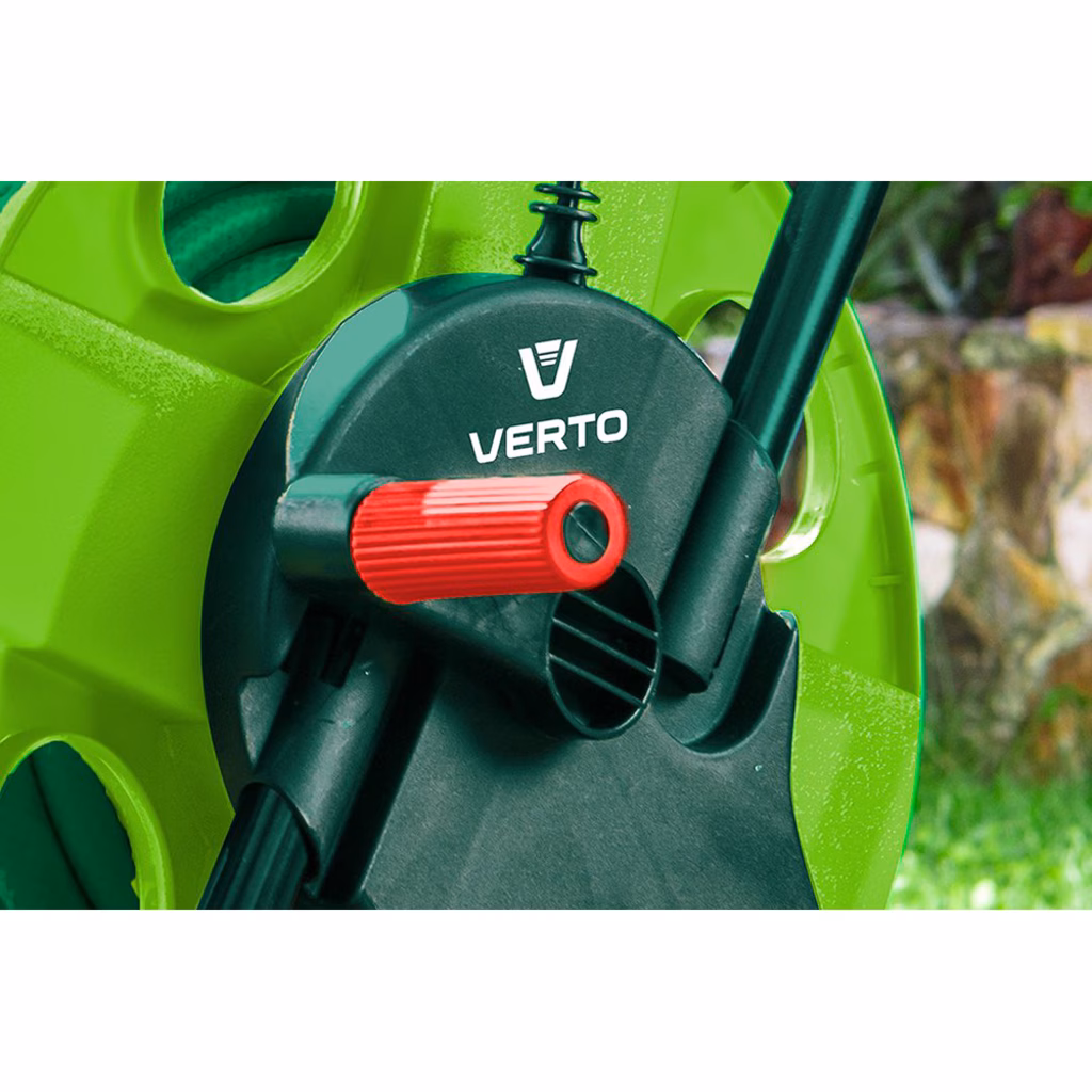 Supporto per avvolgitubo da giardino VERTO a trolley (rif. n. 15G790). Il supporto è realizzato in plastica resistente e viene utilizzato per annaffiare o trasportare e riporre comodamente un tubo da giardino. il trasporto è reso più comodo dalla presenza di due grandi ruote e dall'impugnatura alta. L'avvolgitore può contenere circa 45 m di tubo da 1/2", 35 m di tubo da 5/8", 15 m di tubo da 3/4".