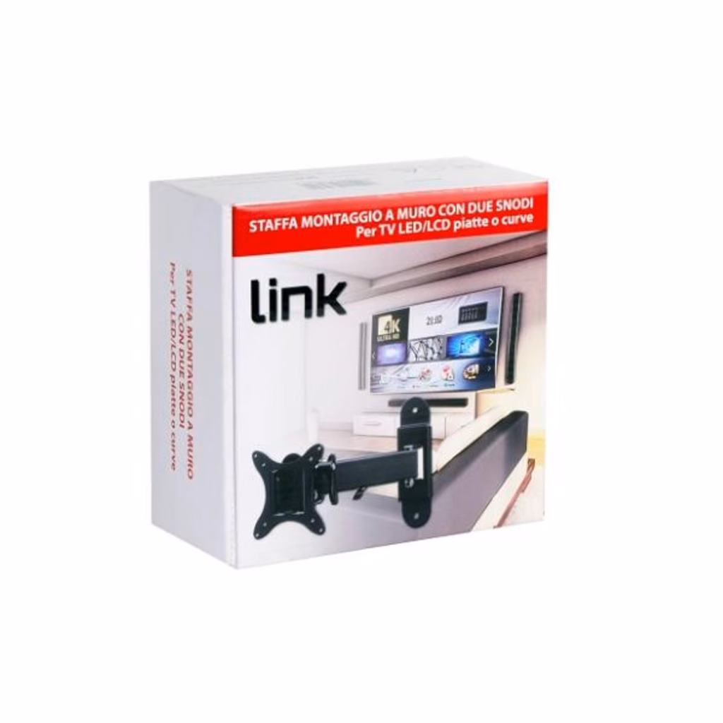 Staffa per montaggio di TV e monitor piatti LED e LCD da 13 a 37 pollici, con un peso fino a 15 kgI suoi 2 snodi permettono la massima flessibilità nel posizionamento del video, con un'inclinazione alto/basso da +15° a -15° e la rotazione laterale di 180° dell'ultimo snodoCostituita da 2 pezzi, un pezzo fisso a muro e l'altro pezzo che si collega alla TV, e si inserisce nel supporto a muro, facilitando così la rimozione per la manutenzionePer standard VESA 75x75, 100x10.Sporge dal muro da 10 a 24.3 cm quando è completamente esteso.Viti, tasselli, attrezzi e gancio guidacavi inclusi.