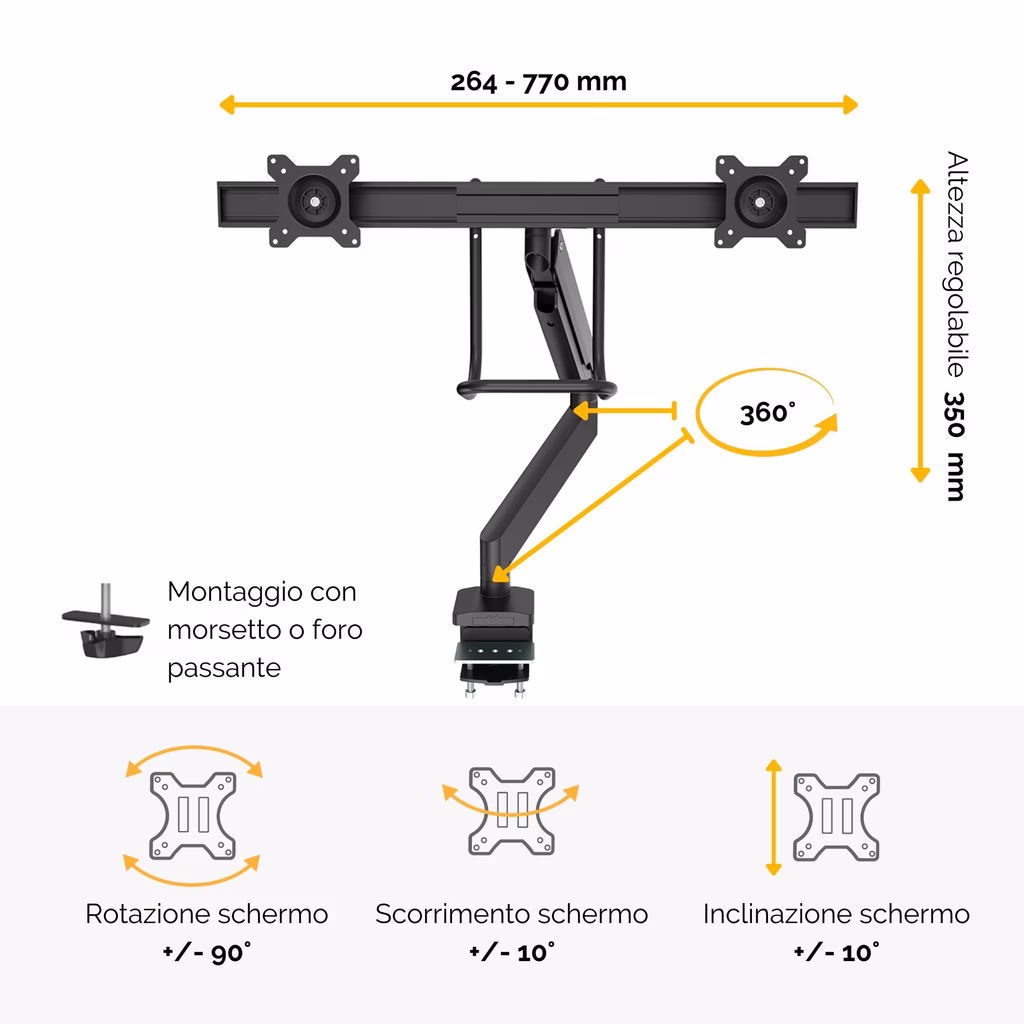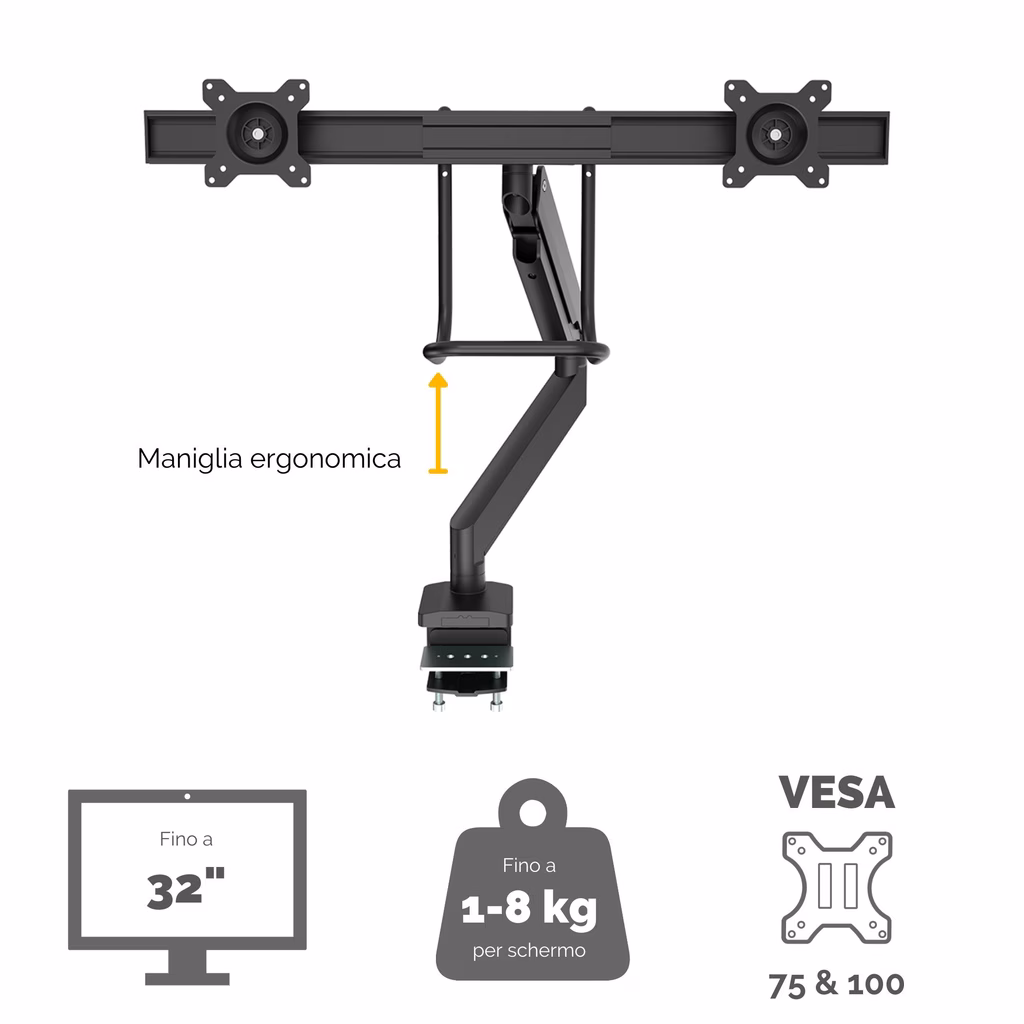 Braccio Monitor doppio che grazie alla barra trasversale garantisce il perfetto allineamento dei due Monitor.La maniglia centrale permette di spostare facilmente i monitor. Monitor max 32", peso 16Kg.