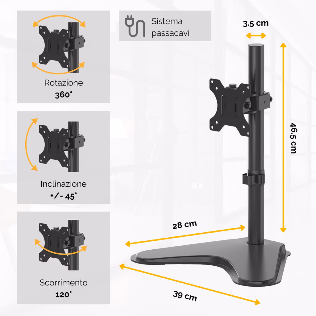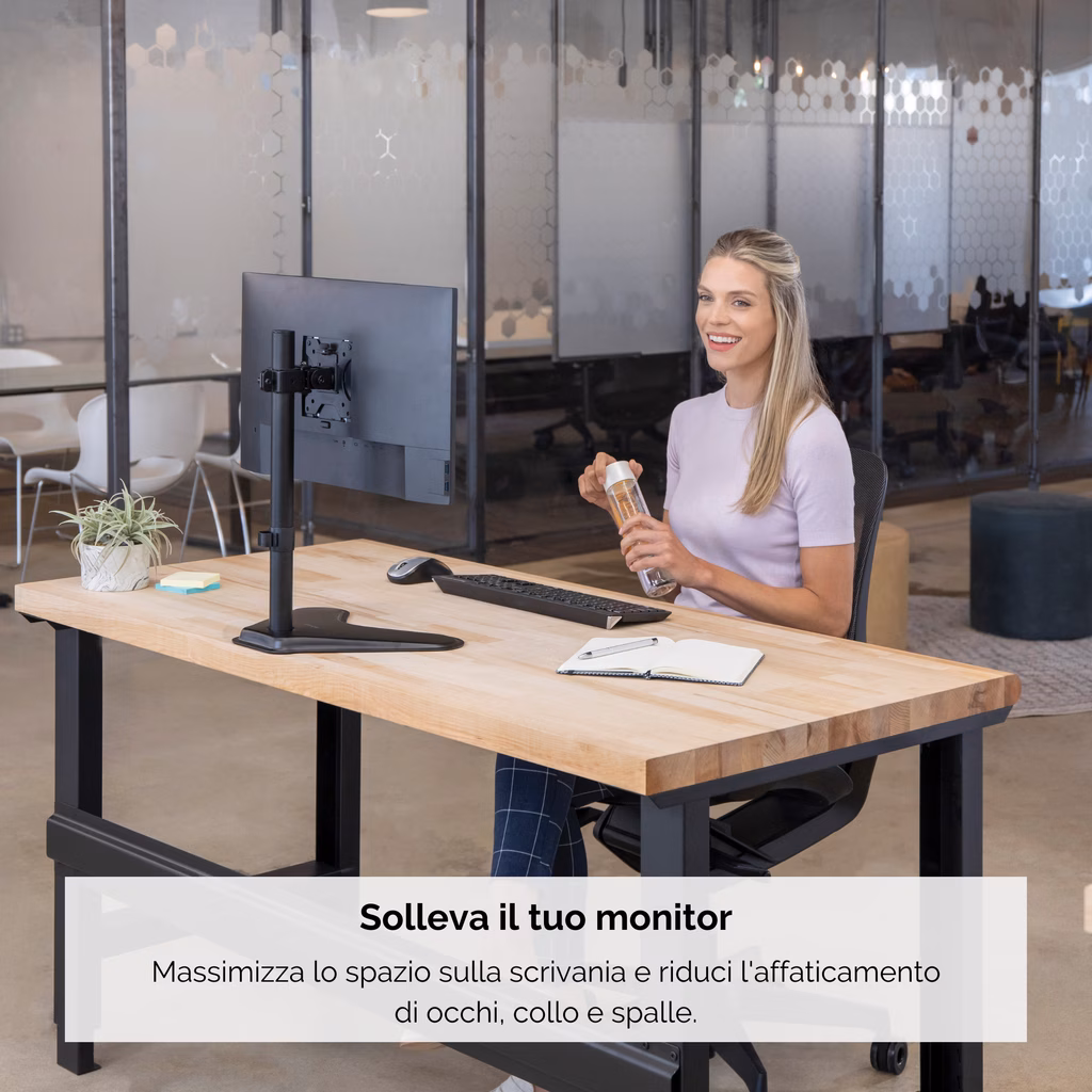 BRACCIO MONITOR SINGOLO CON PIEDISTALLO PROFESSIONAL SERIESSolleva il monitor ad un'altezza comoda per ridurre tensioni agli occhi, collo e spalle.Il design con piedistallo permette di usare un braccio monitor anche in spazi in cui non si può montare con morsetto o foro passante.Essenziale, con sistema ordinacavi incluso.La base pesante assicura la massima stabilità.Fino a 46cm di regolazione di altezza per fissare il livello desiderato.Per monitor fino a 32 (81.28cm) e del peso di massimo 8kg.
