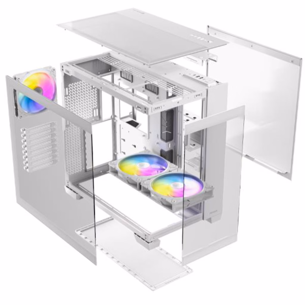 Il pannello frontale e quello sinistro utilizzano un'esclusiva tecnica di smussatura a 45° che rompe la barriera tra i due pezzi di vetro. Il bordo estremamente sottile della giunzione del vetro migliora l'esperienza visiva ininterrotta, panoramica e ultra-trasparente della vista a 270°, consentendo una vetrina completa dei componenti del PC di fascia alta e effetti di luce abbaglianti.