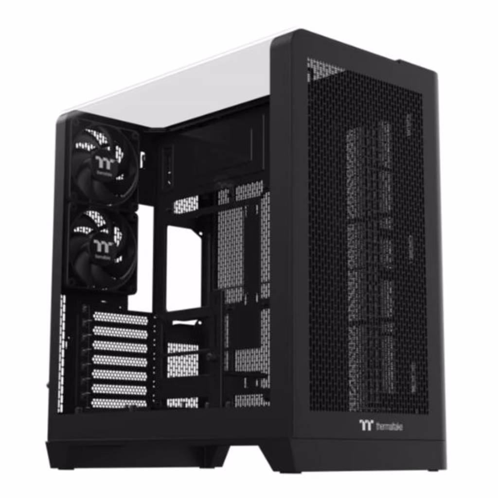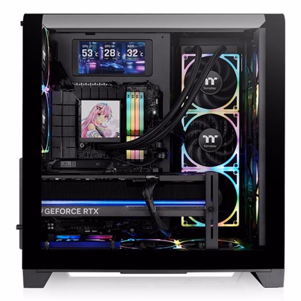 Il case Mid Tower View 390 Air è un ATX con pannello laterale/superiore curvo in vetro temperato, pannello frontale perforato, slot PCI-E girevoli, supporto per GPU e due ventole posteriori CT120. È disponibile un kit opzionale con schermo LCD da 6" per una migliore visualizzazione.