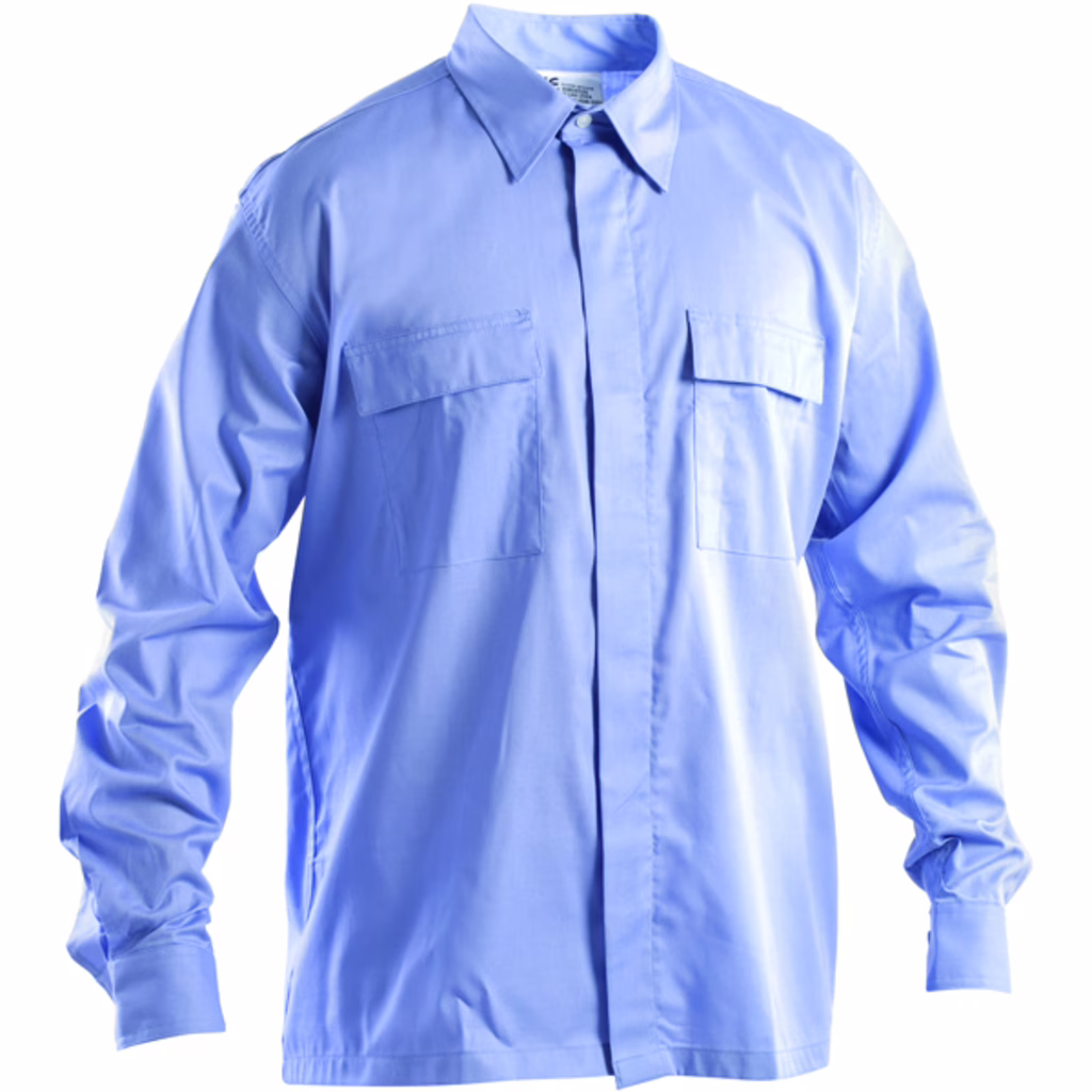 Camicia multinorma trivalente - protezione ignifuga, antistatica e chimica - polsi chiusi con asole e bottoni ricoperti - taschini applicati sul petto con aletta fermata da velcro - pittogrammi esterni sotto il taschino