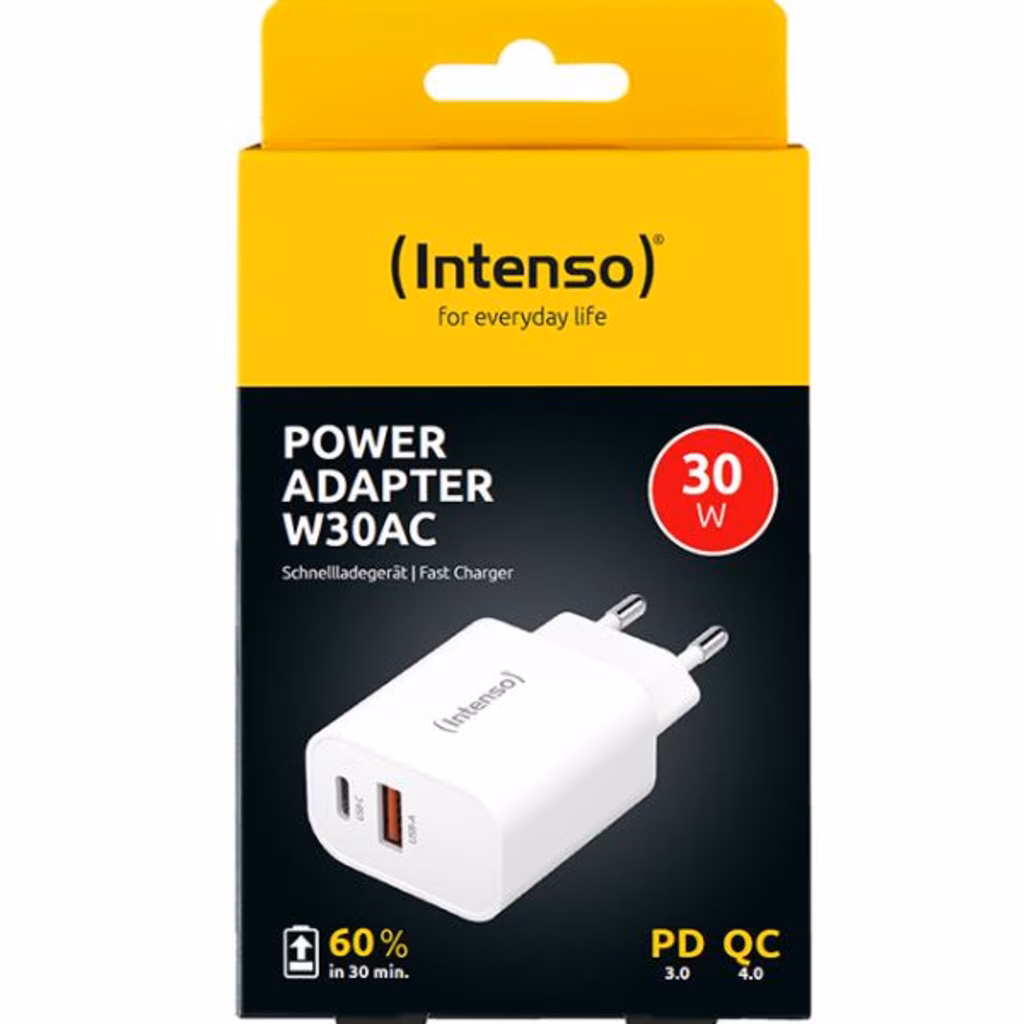 Adattatore di alimentazione W30AC?La tua pratica soluzione di ricarica!Questo versatile adattatore è la soluzione ideale per una ricarica rapida ed efficiente di un'ampia gamma di dispositivi. Con connettori USB-A e USB-C, è la fonte di alimentazione all-in-one perfetta per mantenere i tuoi gadget sempre carichi e pronti all'uso. L'alimentatore W30AC di Intenso unisce prestazioni elevate, design elegante e valore imbattibile. La sua struttura compatta e resistente lo rende il compagno di viaggio ideale, assicurandoti di rimanere connesso ovunque tu sia.
