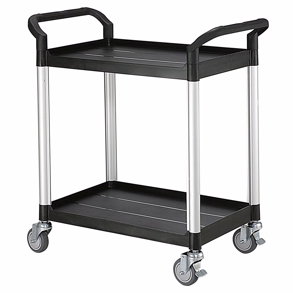 Carrello a 2 ripiani multifunzionale, molto pratico, maneggevole e dal design moderno - profili in alluminio, ripiani in polipropilene rinforzato in fibra di vetro, adatto al contatto con alimenti - i ripiani resistono a temperature di +140 °C e -20 °C, testati secondo gli standard ISO e ASTM - dotato di 4 ruote piroettanti, 2 con freno, realizzate in TPR (gomma termoplastica) e antitraccia - applicabile in molti ambienti come la manutenzione, l'assistenza sanitaria, il settore medico e alimentare