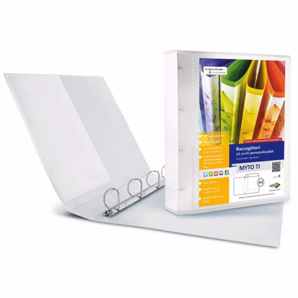 Cartella personalizzabile MYTO TI in PP rigido e semitrasparente. Dotata di tasca interna e meccanismo ad anelli. La tasca sul primo quadrante e sul dorso facilita l'inserimento della personalizzazione