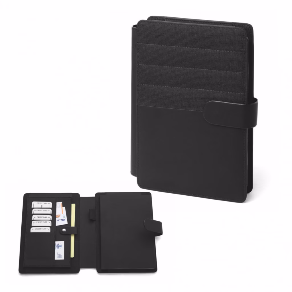 Elegante cartella porta blocco notes realizzata in poliuretano termovirante e poliestere - chiusura con clip metallica - composta da varie tasche porta card - 2 tasche portadocumenti - inserto per penna - blocco interno da 80 fogli in carta avana neutra da 80 g/m2 con bordo colorato nero - logo Tavecchi stampato a secco sul retro - fornito in astuccio di cartone - formato esterno chiuso LxPxH cm 17,5x3x22,5 - formato utile chiuso A5 cm 15x21