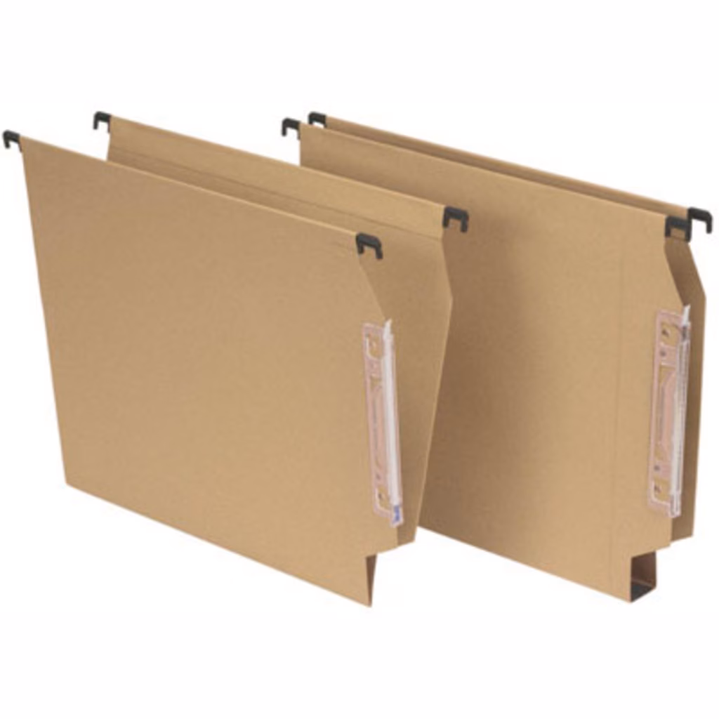 Cartella sospesa in cartoncino Kraft con aste di sospensione in filo d'acciaio armonico rivestito all'estremità con ganci in polistirene nero - portacartellino lenticolare
