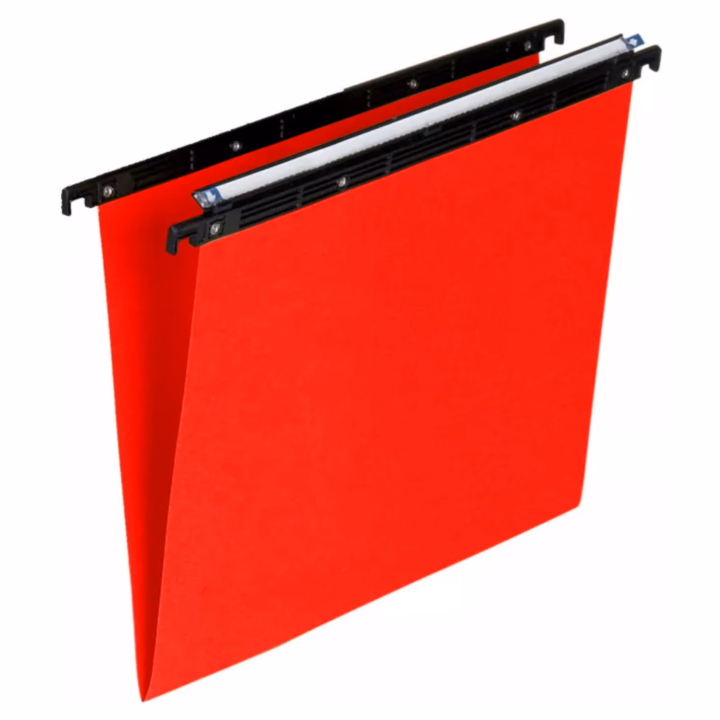 Cartella sospesa di elevata qualità, realizzata in polipropilene, fissata alle aste tramite robusti rivetti metallici, portaetichette in plastica trasparente ad effetto lenticolare, etichette con bordo colorato per l'immediato reperimento dei fascicoli.