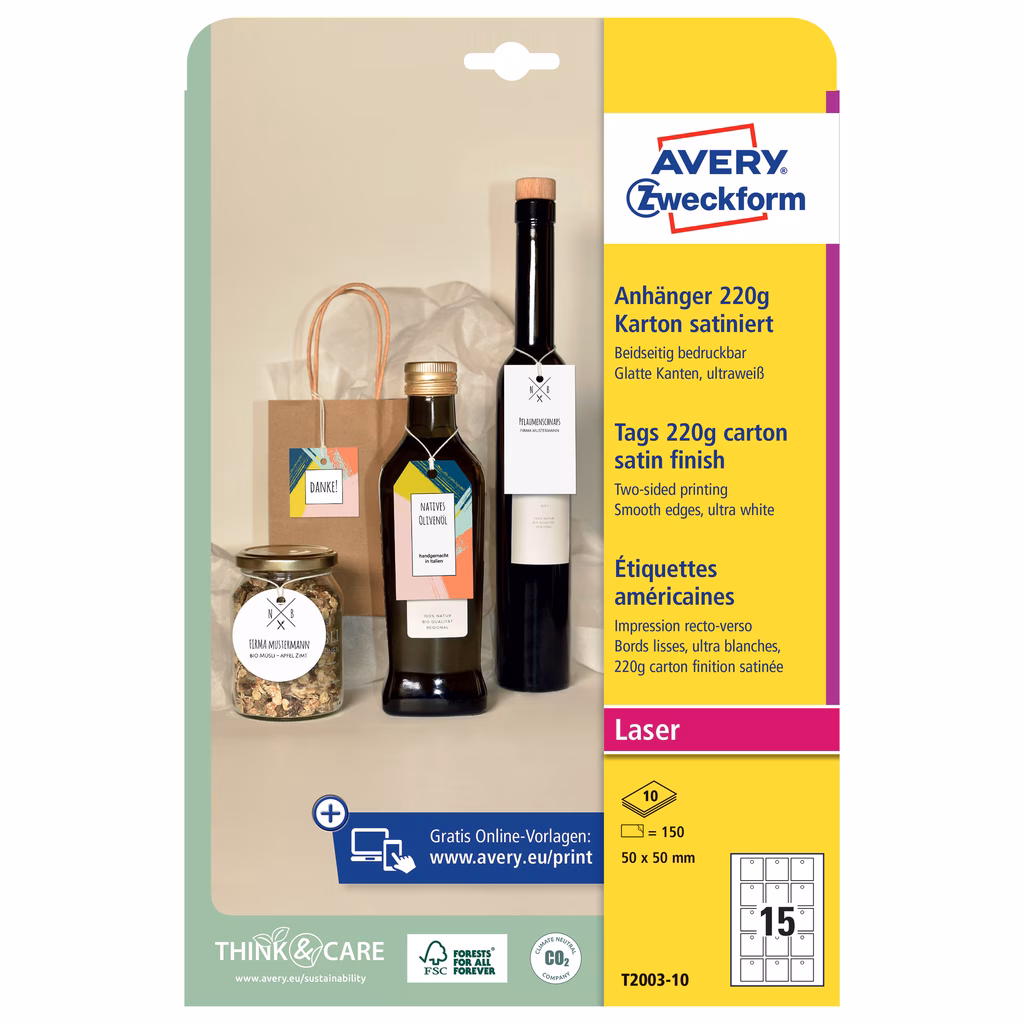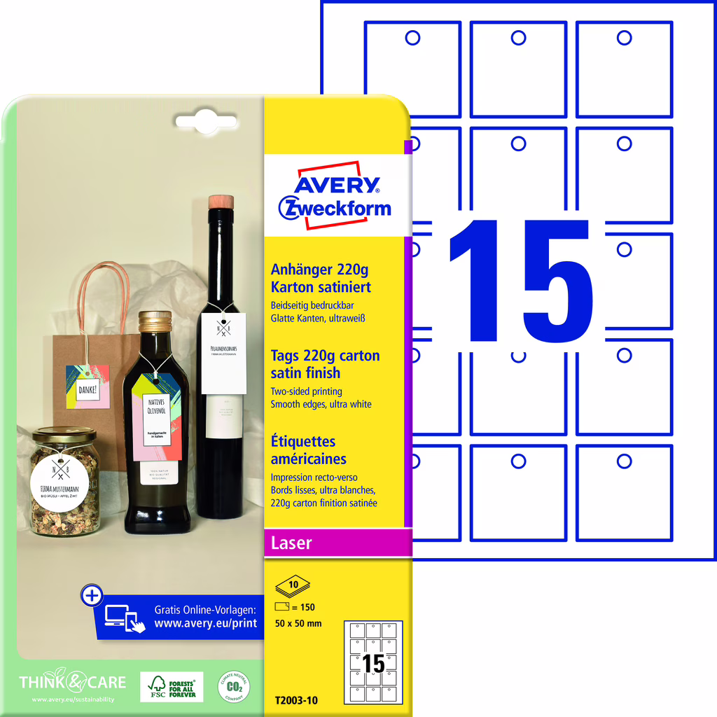 Fai risaltare i tuoi prodotti, catturano immediatamente l'attenzione e offrono lo spazio necessario per fornire tutte le informazioni utili. Perfetti per identificare prodotti, bottiglie, capi di abbigliamento, confezioni regalo. Cartoncino da 220gr composto da materiale che proviene da foreste ben gestite, foreste certificate FSC® e da altre fonti controllate. Cordoncino incluso. Tecnologia Quick&Clean che consente di separarli facilmente dal foglio e ottenere bordi perfettamente lisci. Semplici e veloci da stampare grazie al programma gratuito Crea e Stampa Online di Avery.