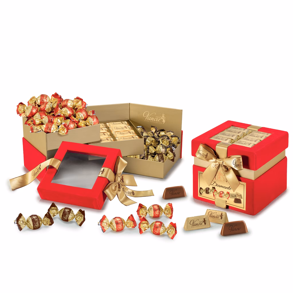 Elegante scrigno portagioie Diamante a 3 scomparti in velluto rosso con fiocco - Boules ripiene crema di nocciole Vanoir 150 g - Boules cioccolato fondente 72% Vanoir 150 g - Gianduiotti 30% Nocciola Vanoir 80 g - unità di vendita: cartone contenente 2 confezioni scrigno Diamante