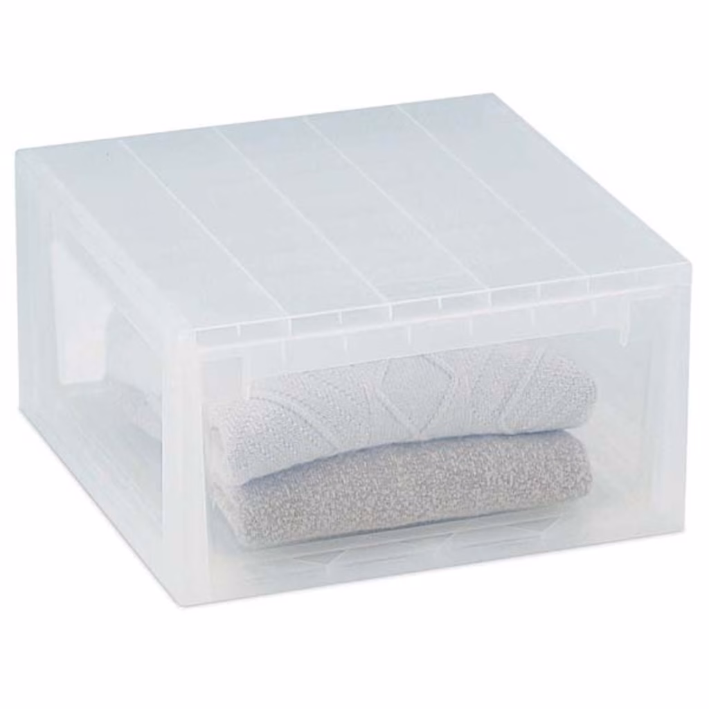 Cassetto multiuso trasparente ed estraibile da entrambi i lati - sovrapponibile e, grazie alle clip di accoppiamento in dotazione, modulabile in orizzontale - ideale anche per riporre accessori, oggettistica, coperte, giacconi, ecc..