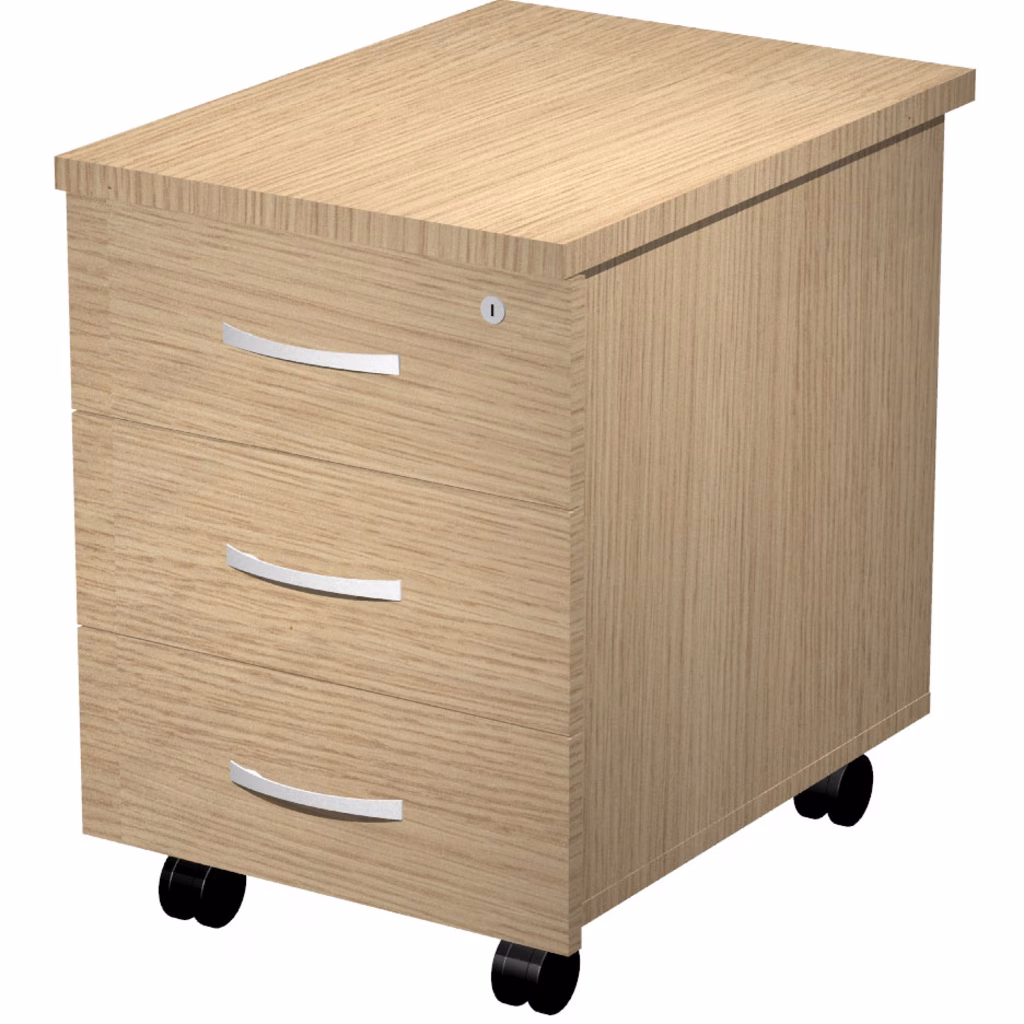 Cassettiera 3 cassetti su ruote, chiusura centralizzata, interno cassetti in metallo vaschetta porta cancelleria. Fornita montata. Dimensioni LxPxH cm 44x60x600. Finitura rovere chiaro