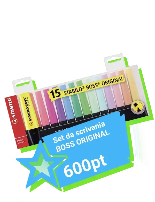 Il nostro programma Click Star, ti permette di accedere a tantissimi premi e sconti a carrello. La raccolta punti prevede che ogni Euro (IVA esclusa) speso su Click Ufficio equivale a 1 punto Click Star.In caso di promozioni 2X punti Click Star per ogni euro speso riceverai due punti Click Star. Il raddoppio può essere applicato per tutti i prodotti presenti a catalogo oppure su una selezione di categorie. Questo ti permette di poter cumulare più velocemente i punti e raggiungere facilmente i tuoi obbiettivi. I punti si possono riscattare tramite: