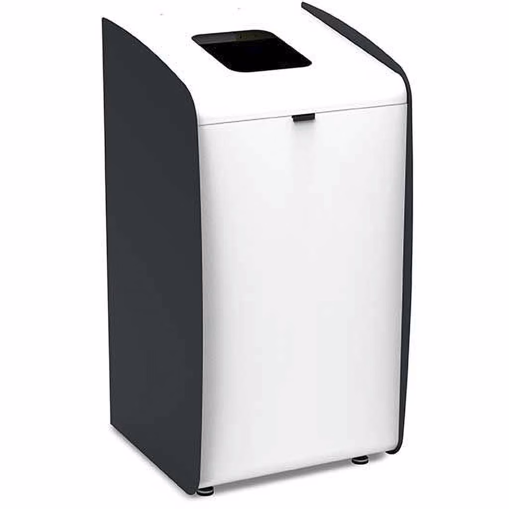 Struttura in metallo verniciato; Versione "Classic" con apertura sportello superiore; sistema reggisacco integrato; 4 piedini regolabili in altezza; ideale per creare isole ecologiche; in opzione, kit quattro ruote Ø 40 mm (2 ruote con freno).