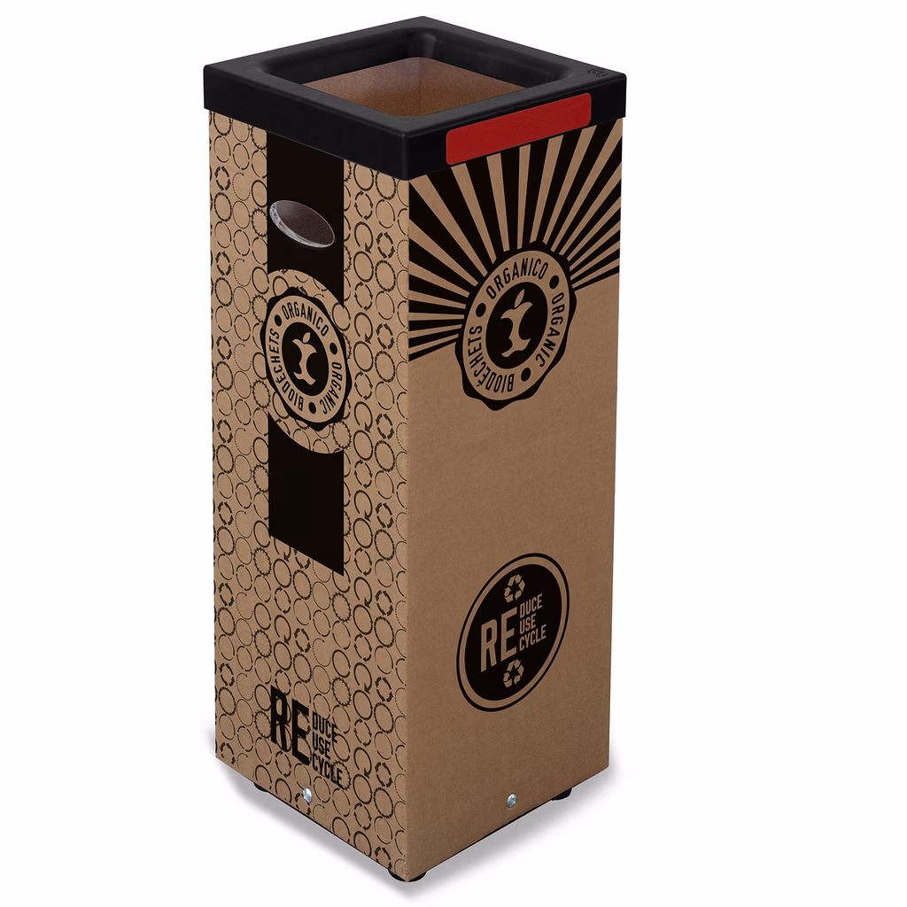 Cestini per raccolta differenziata realizzati in robusto cartone spessore mm 7 con coperchio in plastica riciclata nera + 4 adesivi colorati e fondo in lamiera verniciata con piedi salvapavimento in polopropilene - forniti stesi per il minimo ingombro, si montano facilmente con cacciavite