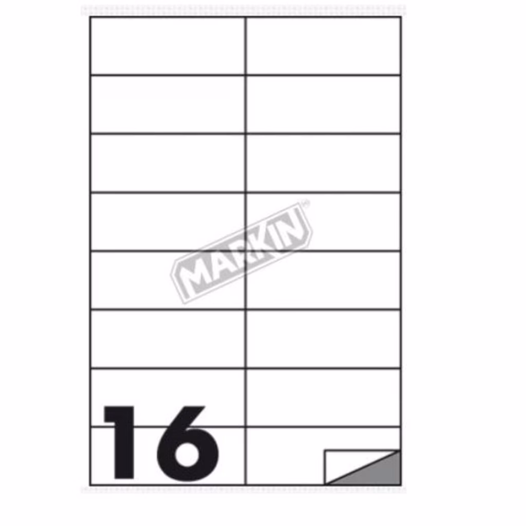 CARATTERISTICHE:Colore: biancoMisure: 105x37,12 mmGrammatura: 70grFogli/Conf: 100Eti per conf: 1600Eti per foglio: 16Adesivo: rimovibile