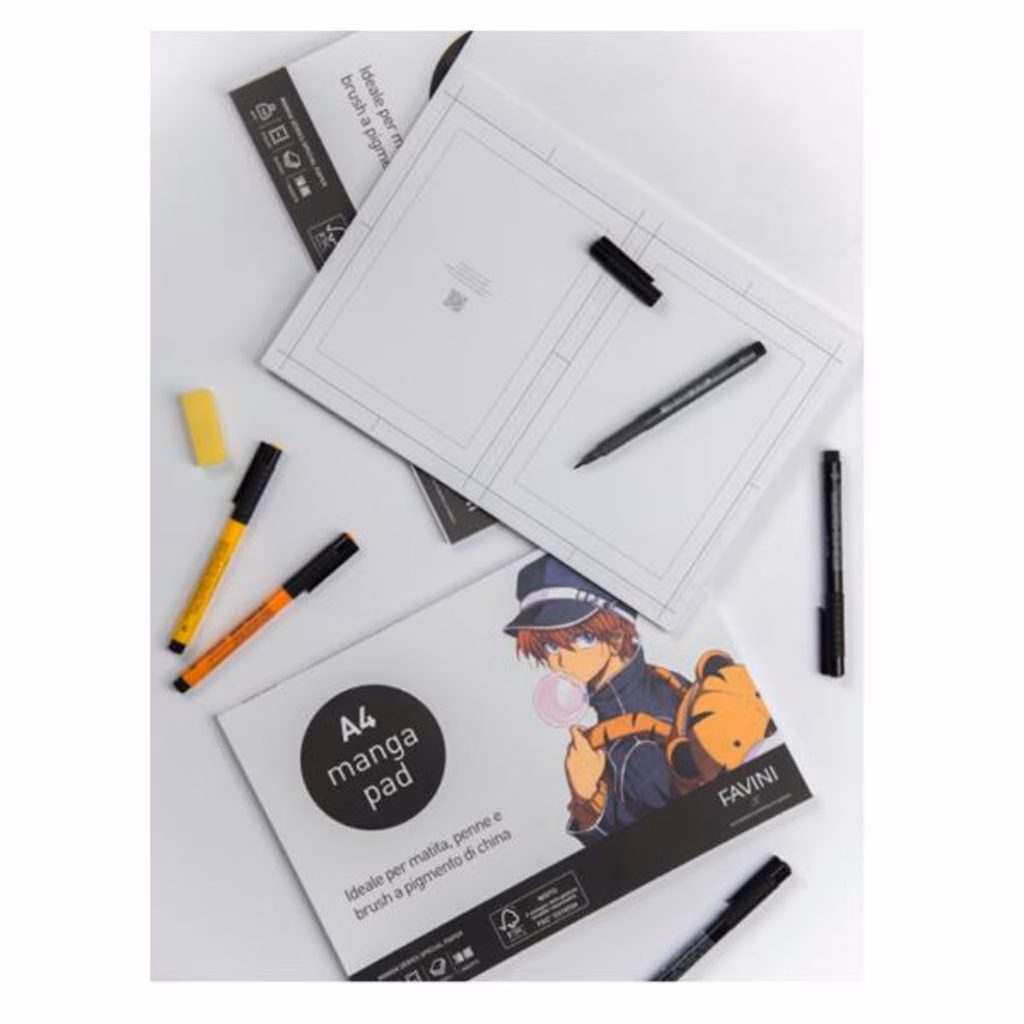 Blocco in carta di altissima qualità, ideale per matita, penne e brush a pigmento di china. Pensato e realizzato in collaborazione con l Accademia Europea di Manga e ispirato al mondo del disegno giapponese. All interno del blocco A4 è presente un foglio con gabbia grafica che consente di realizzare la misura perfetta di un fumetto.