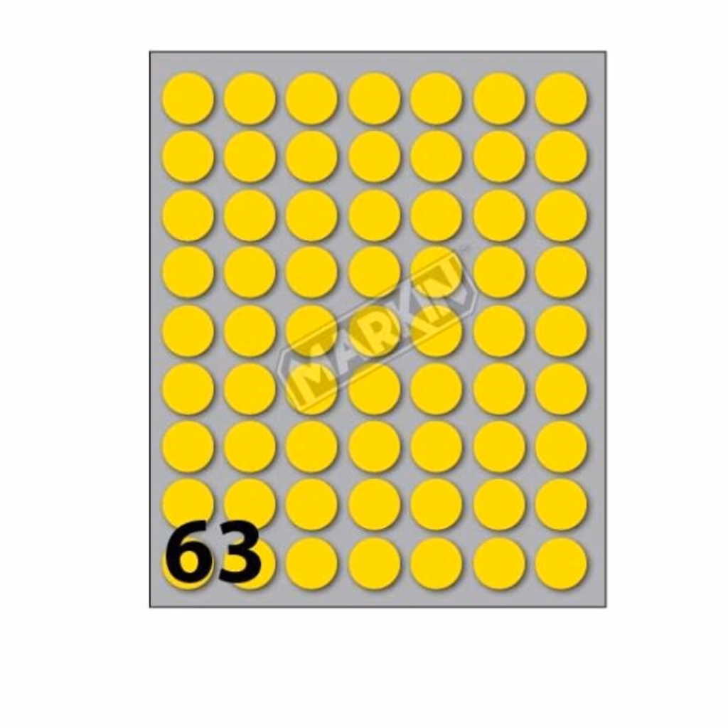 Busta etichette gialle diam. 14mm. In busta da 10 fogli formato 152,5x125mm. Adesivo permanente.