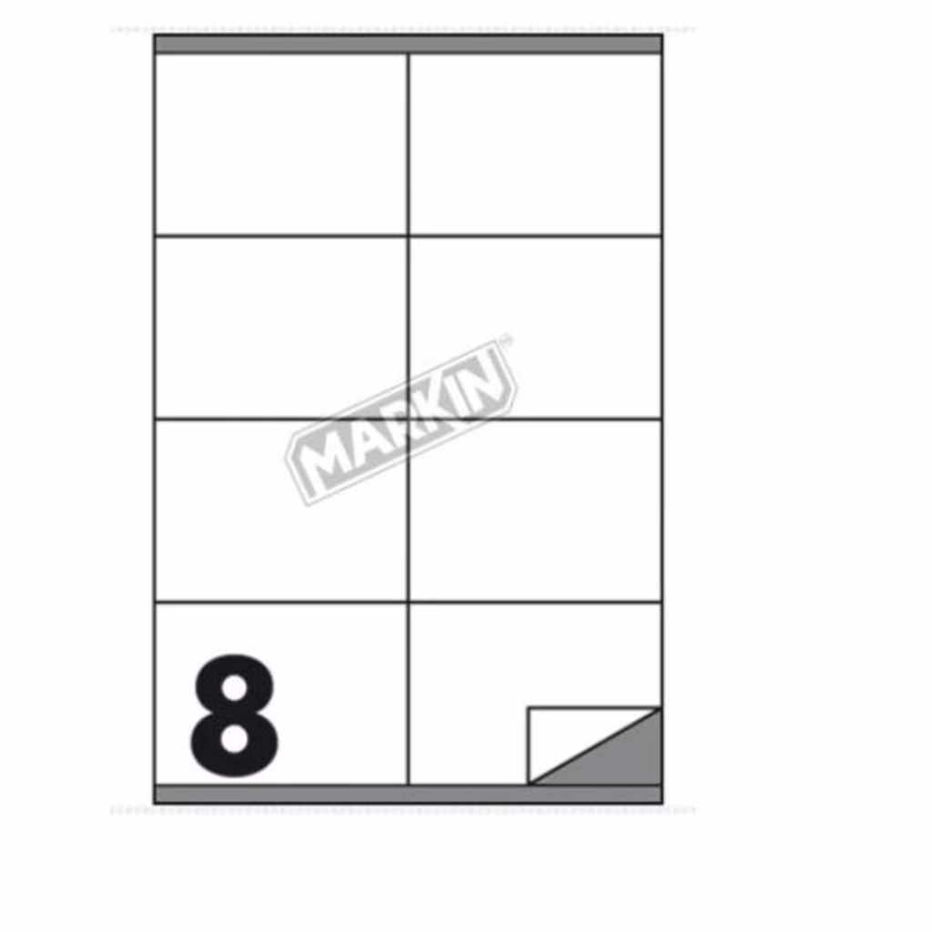 CARATTERISTICHEColore: biancoMisure: 105x72 mmGrammatura: 70grFogli/Conf: 100Eti per conf: 800Eti per foglio: 8Adesivo: rimovibile