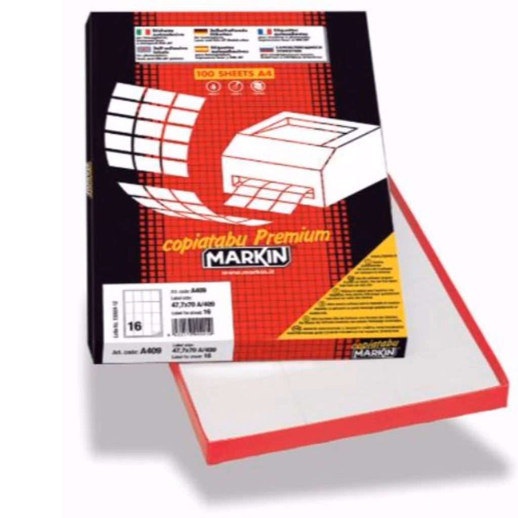 Scatola 100 fogli etichette bianche Copiatabu 105x72mm. Con margine. In scatola da 100 fogli formato A4. Adesivo rimovibile. Ottima resistenza al calore. Buona adesione su cartoni e superfici non-polar. Buona adesione anche alle basse temperature -20°+100°C. Carta di pura cellulosa lisciata in macchina. Grammatura 70 g/m2 ISO 536. Punto di bianco 98% ISO 2470/1. Stampabilità: INKJET, LASER e fotocopie, flexo, offset, tipo e serigrafia.