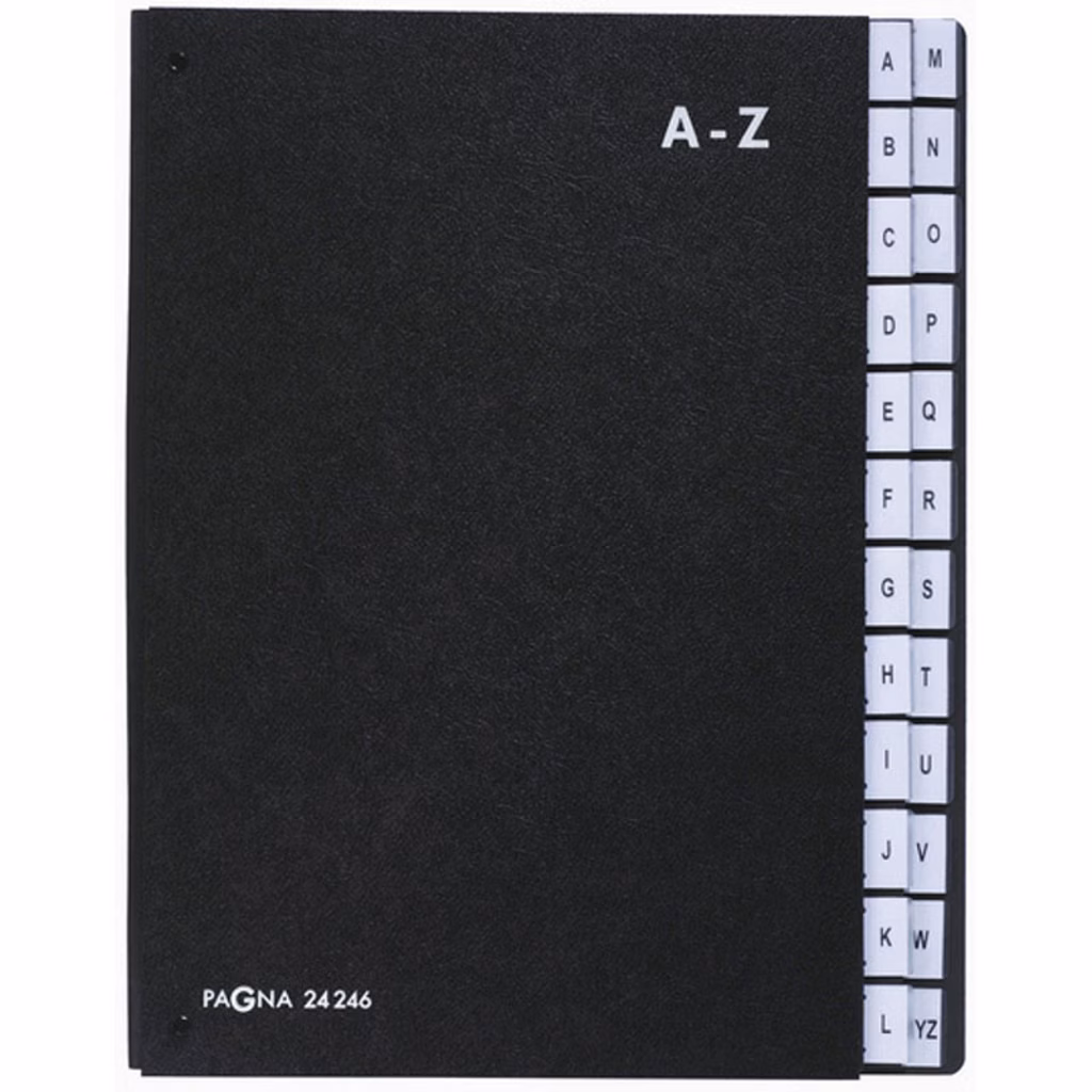 Classificatore alfabetico "Classic", per documenti in formato A4, dotato di 24 divisori. Realizzato con copertina rigida in cartone nero goffrato da 1,6 mm e divisori interni neri da 250 g/m². Dorso a soffietto rinforzato in tela per una capacità di archiviazione particolarmente elevata. 3 fori per identificazione dei documenti, pagine antistrappo, linguette in PP resistente A-Z (alfabeto internazionale) per l'accesso rapido. Certificato Blue Angel